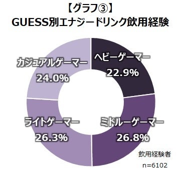 また、ゲーマーをゲームとのエンゲージメントの強弱でセグメンテーションした弊社の独自指標である『GUESS』で分類したところ、「ミドルゲーマー」が26.8%、「ライトゲーマー」が26.3%、「カジュアルゲーマー」が24.0%、「ヘビーゲーマー」が22.9%という結果になりました。【グラフ③】