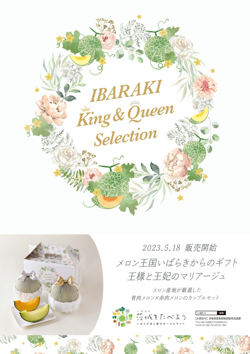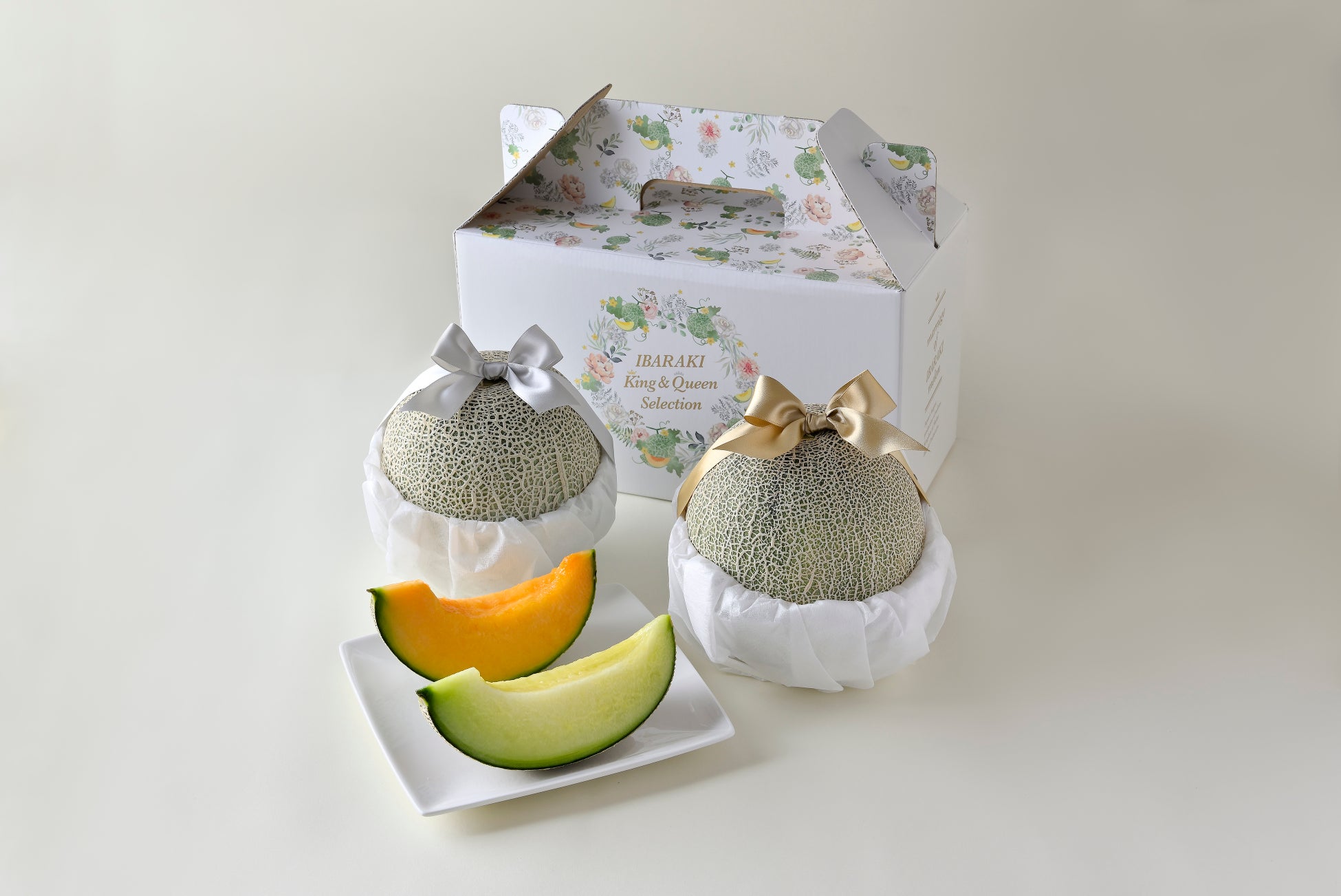 「IBARAKI melon King & Queen Selection」は茨城県オリジナル品種の青肉メロン「イバラキング」と、赤肉メロンの「クインシー」または「レノン」をセットにした青赤2種類のメロンを一度に楽しめる贈答用メロンセットです。
