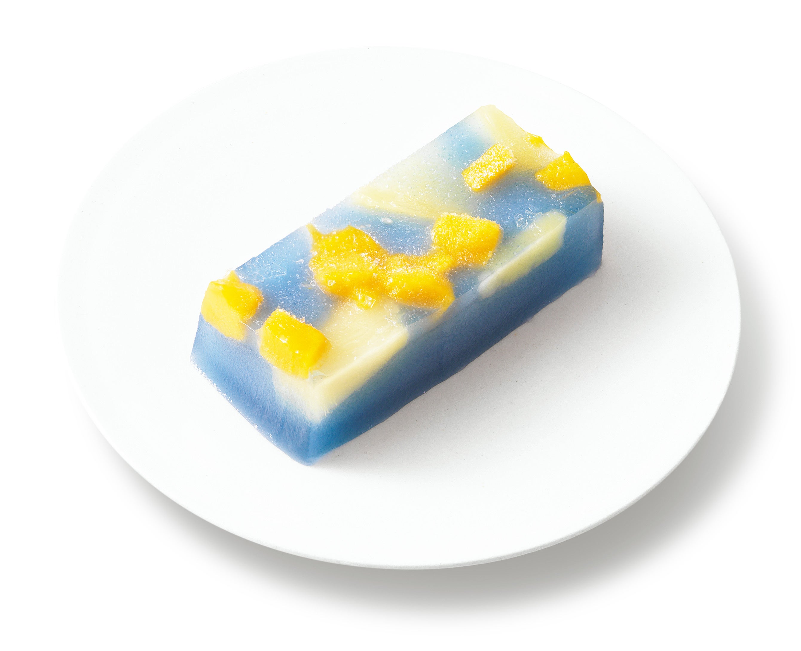 ソーダ風味の葛アイスに、パインとマンゴーをトッピングしました。 見た目も爽やかな、夏らしいスイーツです。