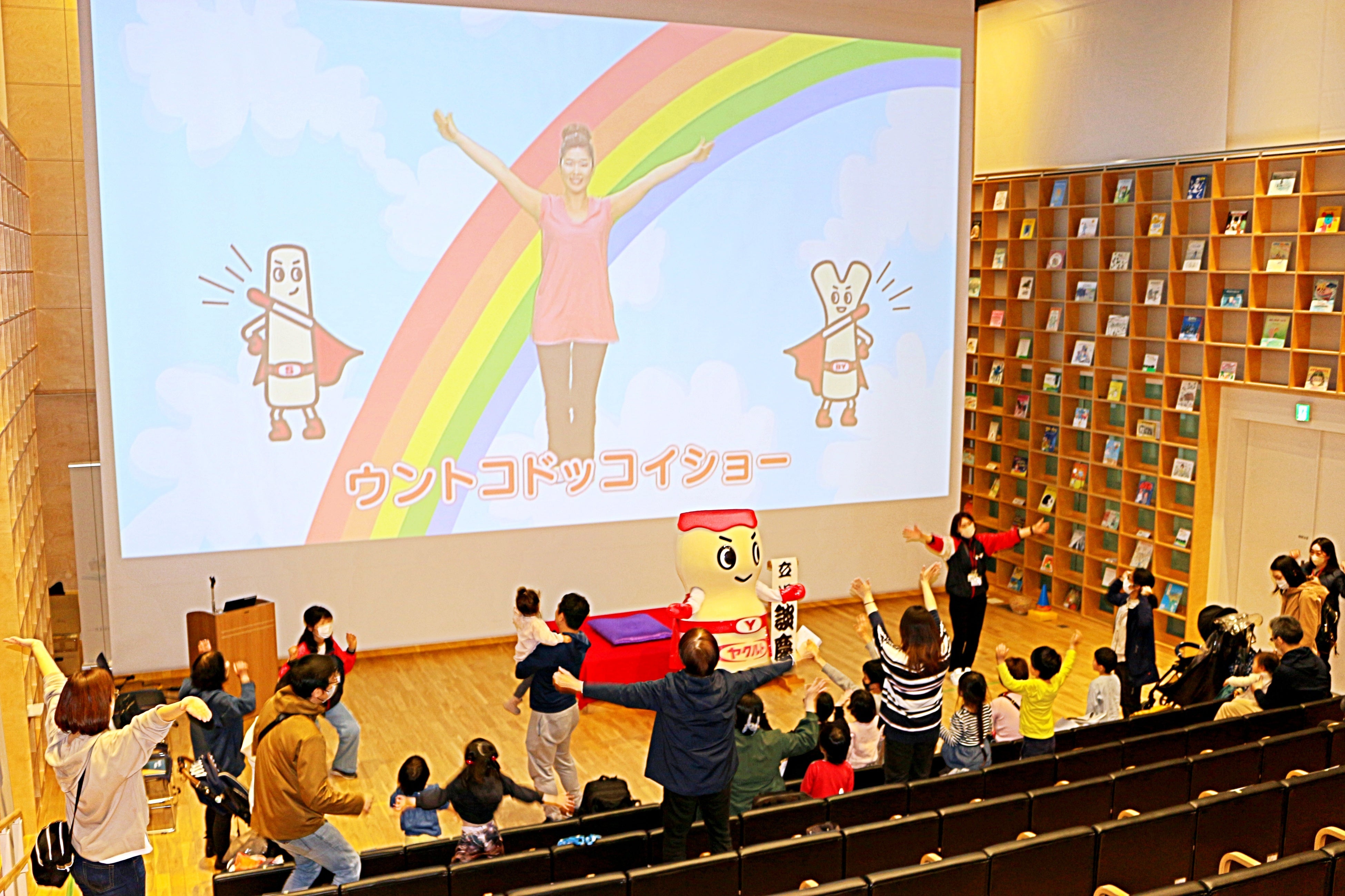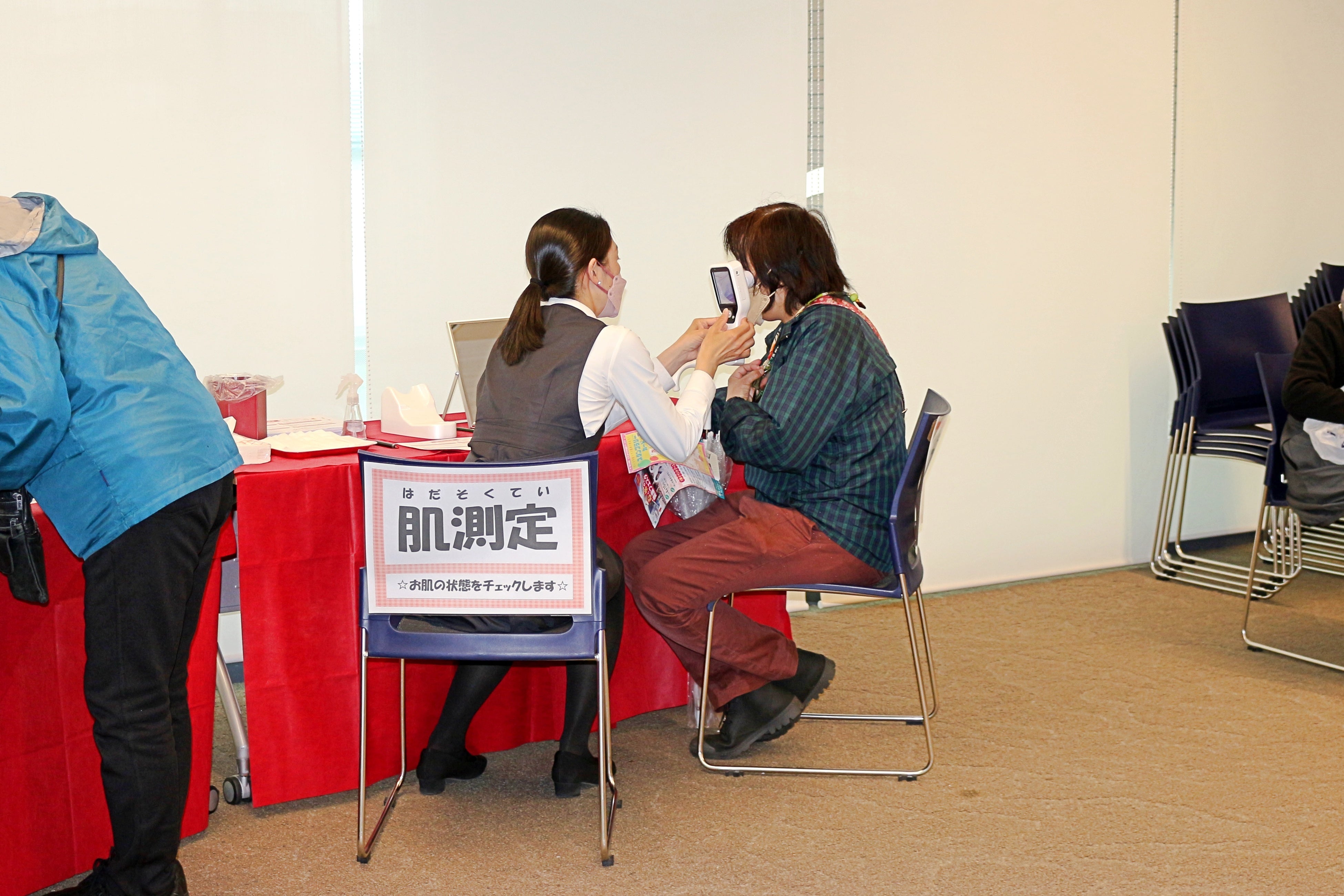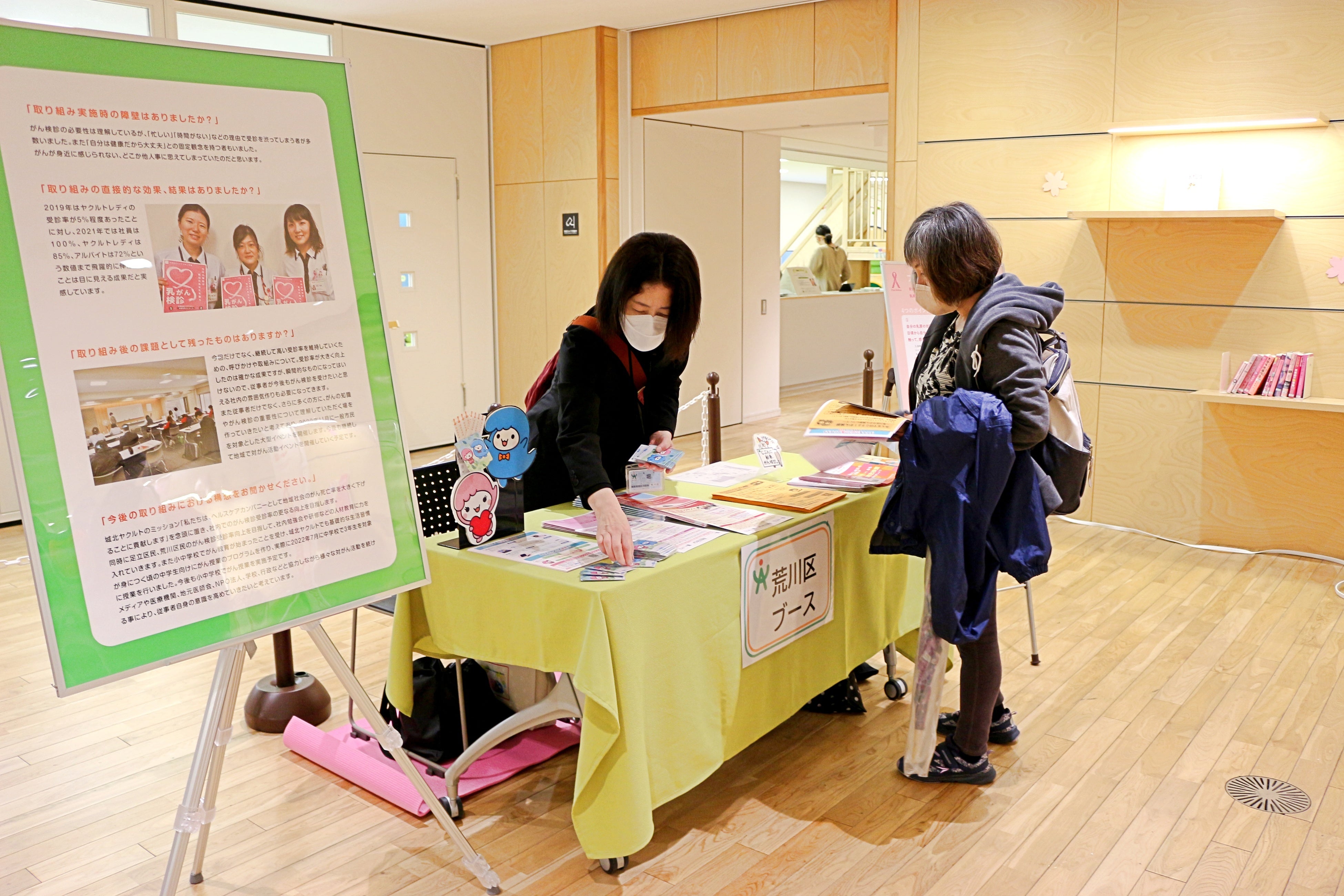 会場には荒川区によるがん検診啓発ブースの設置や、がんになるリスク(可能性)をシミュレーションできるコーナー、お肌年齢の測定コーナー、子ども向けの「おなか体操」を踊るエリアなども設置。