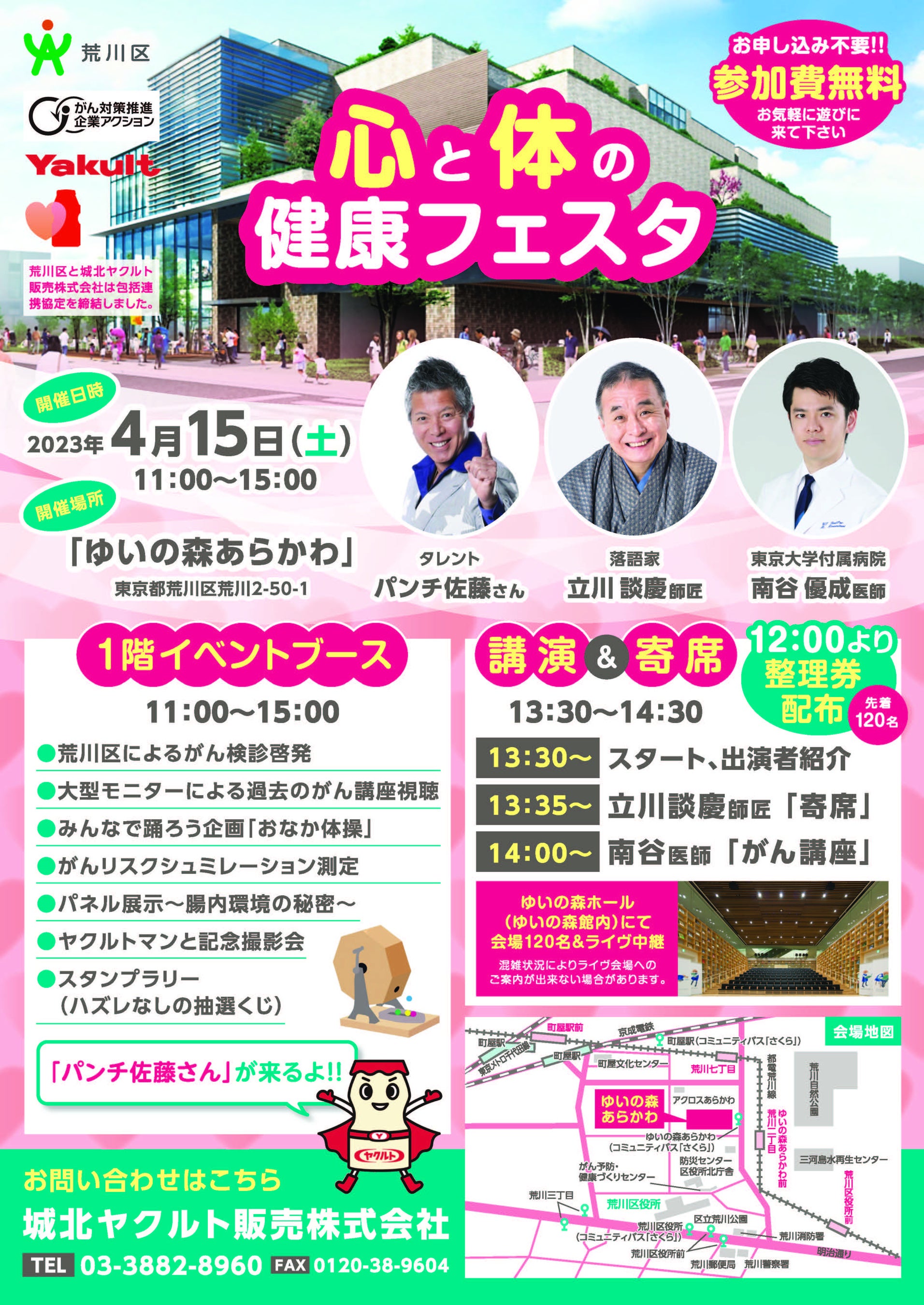 城北ヤクルト販売株式会社は、2022年に荒川区と「がん知識の啓発・がん検診率の向上等に向けた包括連携協定」を締結。当社と荒川区で協力しながら、イベント等の楽しい時間を通して”健康について考えるきっかけとなる場”を定期的に開催しています。