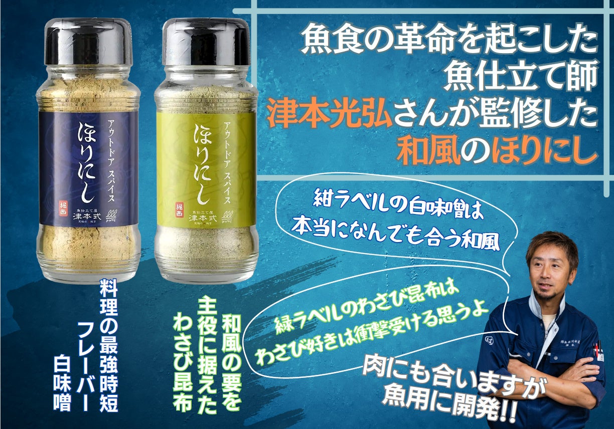 アウトドアシーンで、『ふりかけるだけで美味しくなる魔法のスパイス!』と多くのファンを獲得し、その味の奥深さにハマって家庭でも常備する人が増えているという『アウトドアスパイス・ほりにし」と、魚の食材としての価値を『究極の血抜き」という技法で大きく広げた『津本式』のコラボにより完成した、魚用スパイスです。