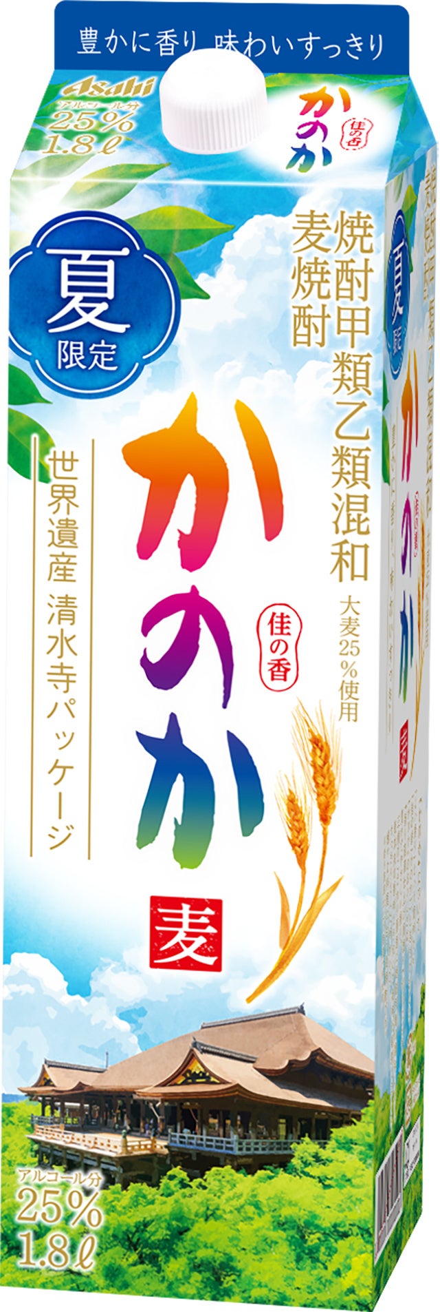 『麦焼酎 かのか 25度 紙パック1.8L 23年夏限定デザイン』は、新緑と世界遺産の清水寺を描きました。メリハリのある色鮮やかなデザインで、店頭での商品の視認性を高めます。パッケージの側面には、「かのか」オリジナルの夏におすすめの飲み方“かのかモヒート”のレシピや「清水寺」の紹介を掲載し、女性や若年層を中心に焼酎の新規飲用者の拡大を図ります。