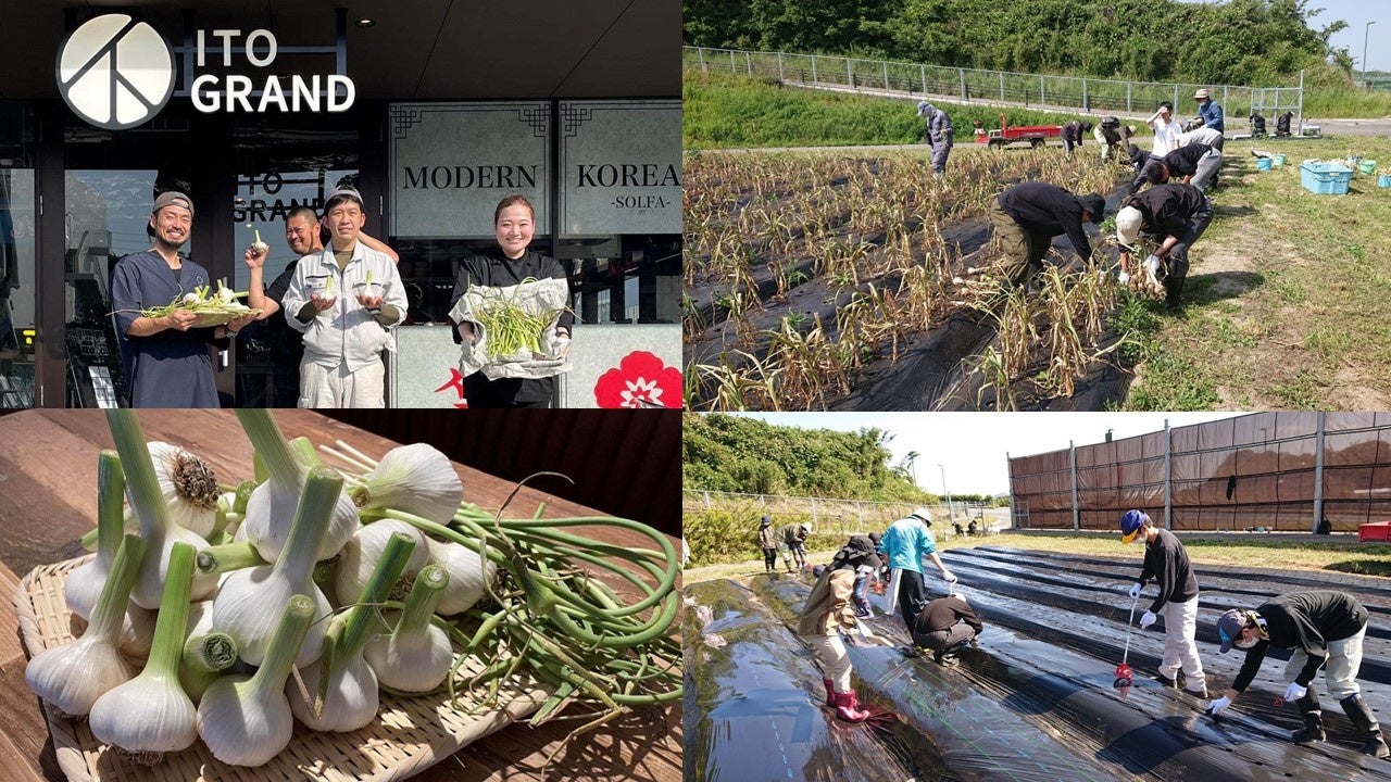 同フェアで使用するニンニクは、ITO GRANDから程近い九州大学伊都キャンパスにある農学部附属農場にて、農場実習教育の一環で学生が畑作りから植え付け、収穫・調整作業(根と外葉を落とす作業)まで一から栽培したものです。