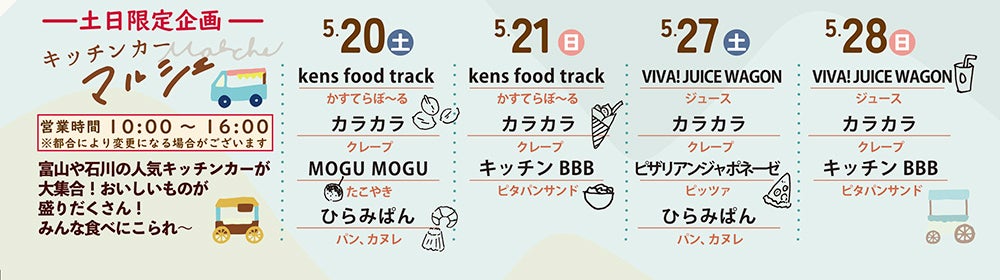 今回のささら屋福光本店工場祭でも、昨年に続き土日限定で富山や石川の人気店が集まる「キッチンカーマルシェ」を開催。普段ささら屋をご利用いただくお客様と「北陸の美味しいお店」との出会いのきっかけ作りとして、日替わりで特色のある人気グルメをお楽しみいただけます。