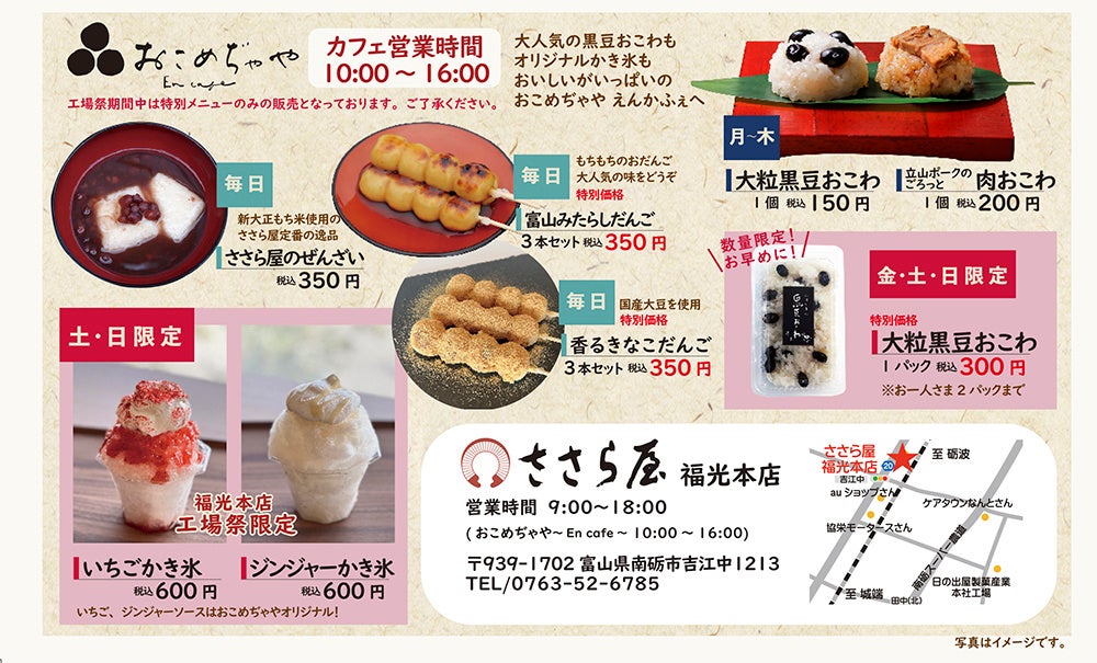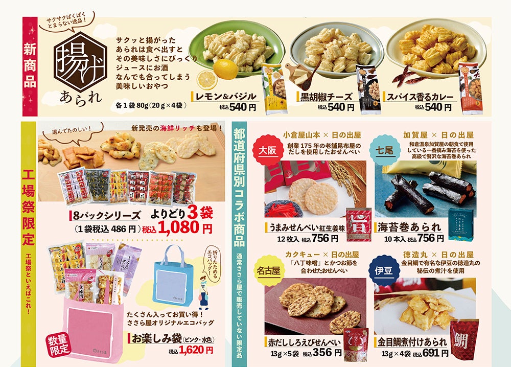 新商品の「揚げあられ」3品をはじめ、工場祭限定の8パックシリーズよりどり3袋、ささら屋オリジナルトートバッグ入り詰め合わせ「おたのしみ袋」、都道府県別コラボ商品4品なども販売。富山米100%の人気のだんごやおこわ、ぜんざいを数量限定で販売。ささら屋のおすすめ米菓と北陸の美味しい食べ物を取り揃えて、皆さまのご来店をお待ちしています!