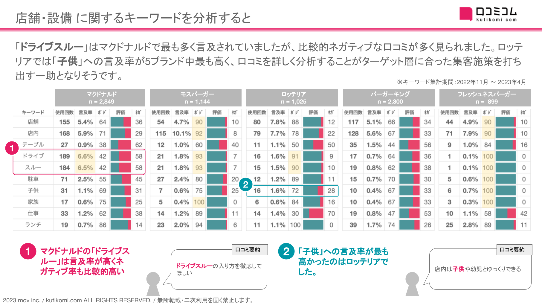 「ドライブスルー」はマクドナルドで最も多く言及されていましたが、比較的ネガティブな口コミが多く見られました。ロッテリアでは「子供」への言及率が5ブランド中最も高く、口コミを詳しく分析することがターゲット層に合った集客施策を打ち出す一助となりそうです。