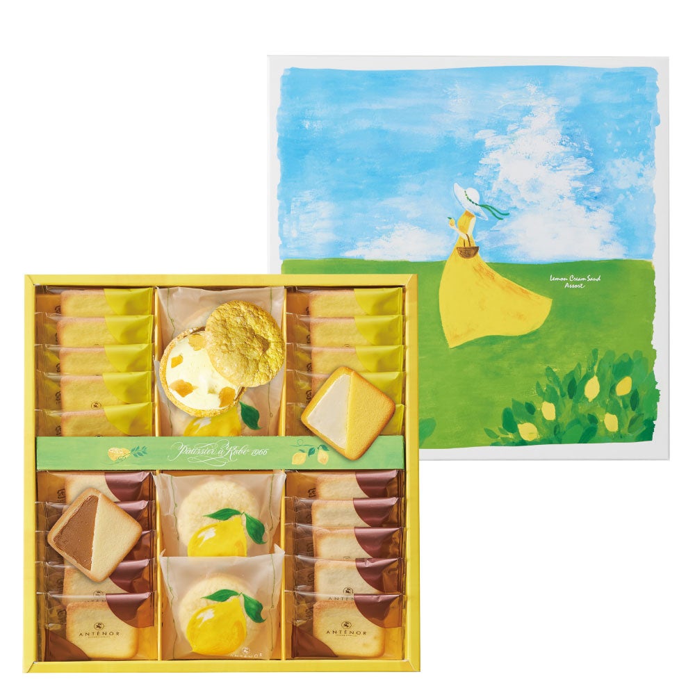 アンテノールの店頭・オンラインショップにて 5/20(土)より、甘酸っぱいレモンづくしの夏限定の焼き菓子ギフトを販売いたします。さわやかなレモン果実、風がふきぬけるレモン畑でレモン摘みをする女性を、かわいいイラストで描いたパッケージに、夏のおいしさを詰めてお届けします。 ※プレゼント商品ではございません。