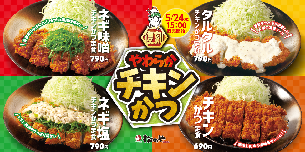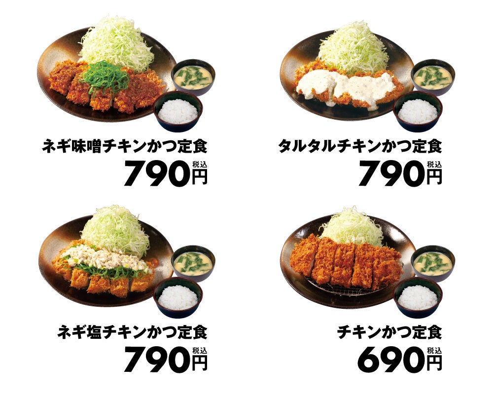 商品名 チキンかつ定食 690円 ネギ味噌チキンかつ定食 790円 タルタルチキンかつ定食 790円 ネギ塩チキンかつ定食 790円 ※全て税込価格です。また、店内・お持ち帰りの税込価格は同一です。 ※お持ち帰りいただけます。お持ち帰りのみそ汁は、別途60円でお買い求めいただけます。 発売日 2023年5月24日(水)午後3時 ~ 対象店舗 一部店舗を除く全国の松のや・松乃家 高速PA店舗では、販売いたしません。 |