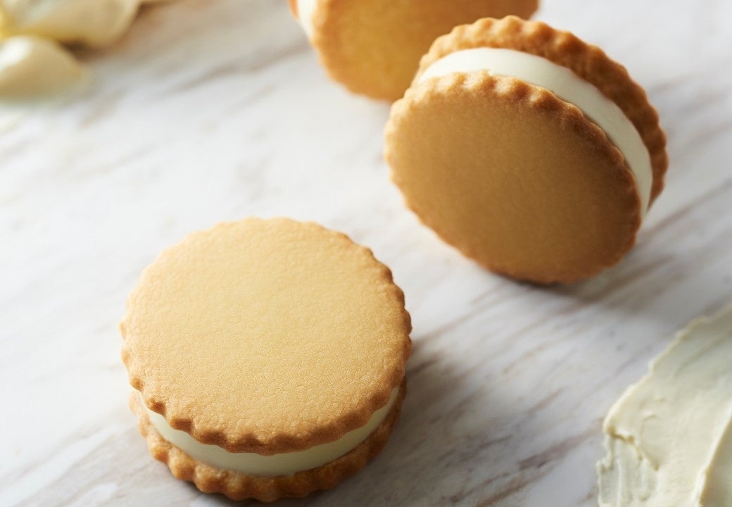 しっとりとしたバターサブレで、デンマーク王室御用達ブランドのクリームチーズ「Arla BUKO」を使用したレアチーズケーキをサンドしました。