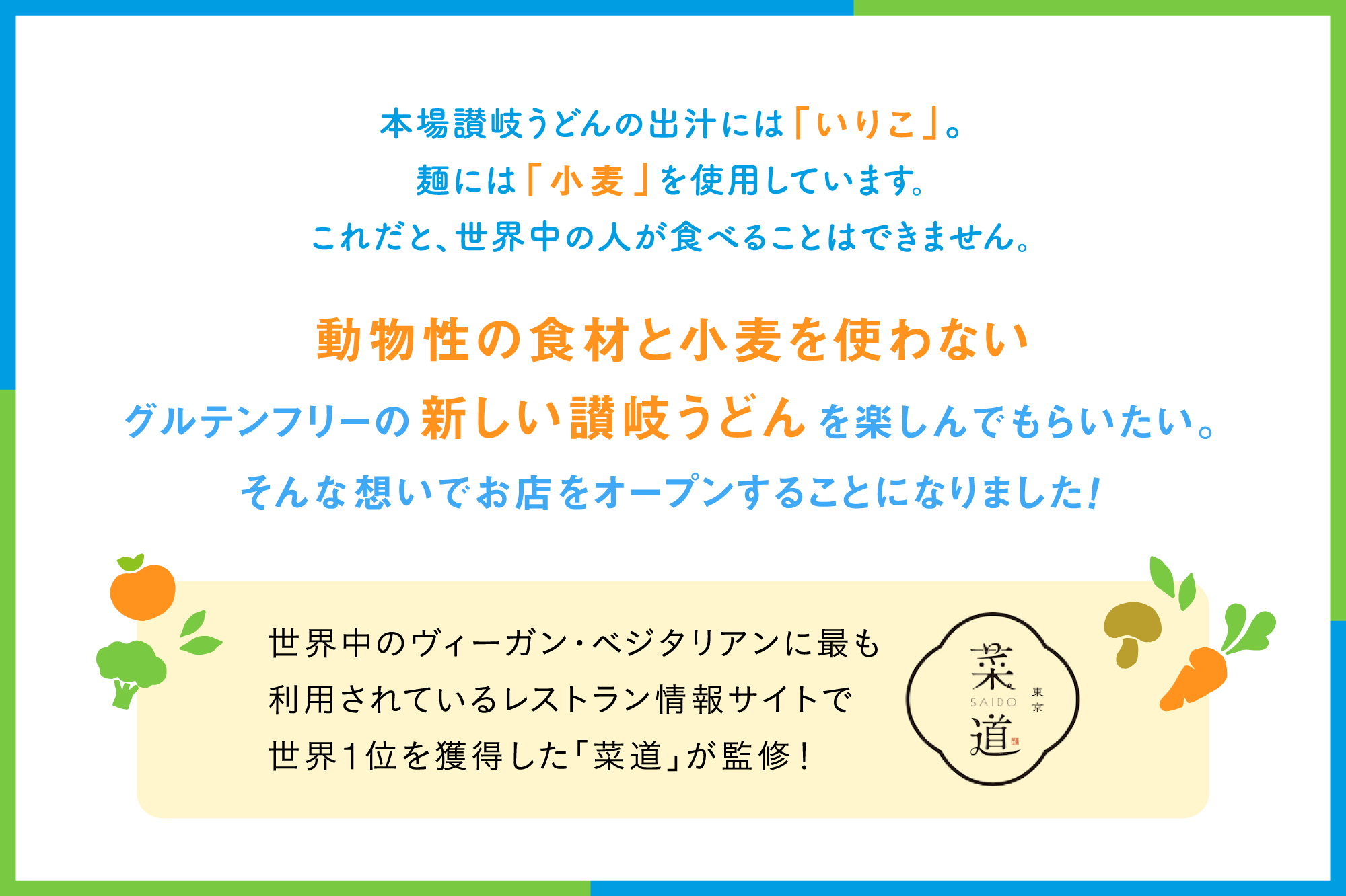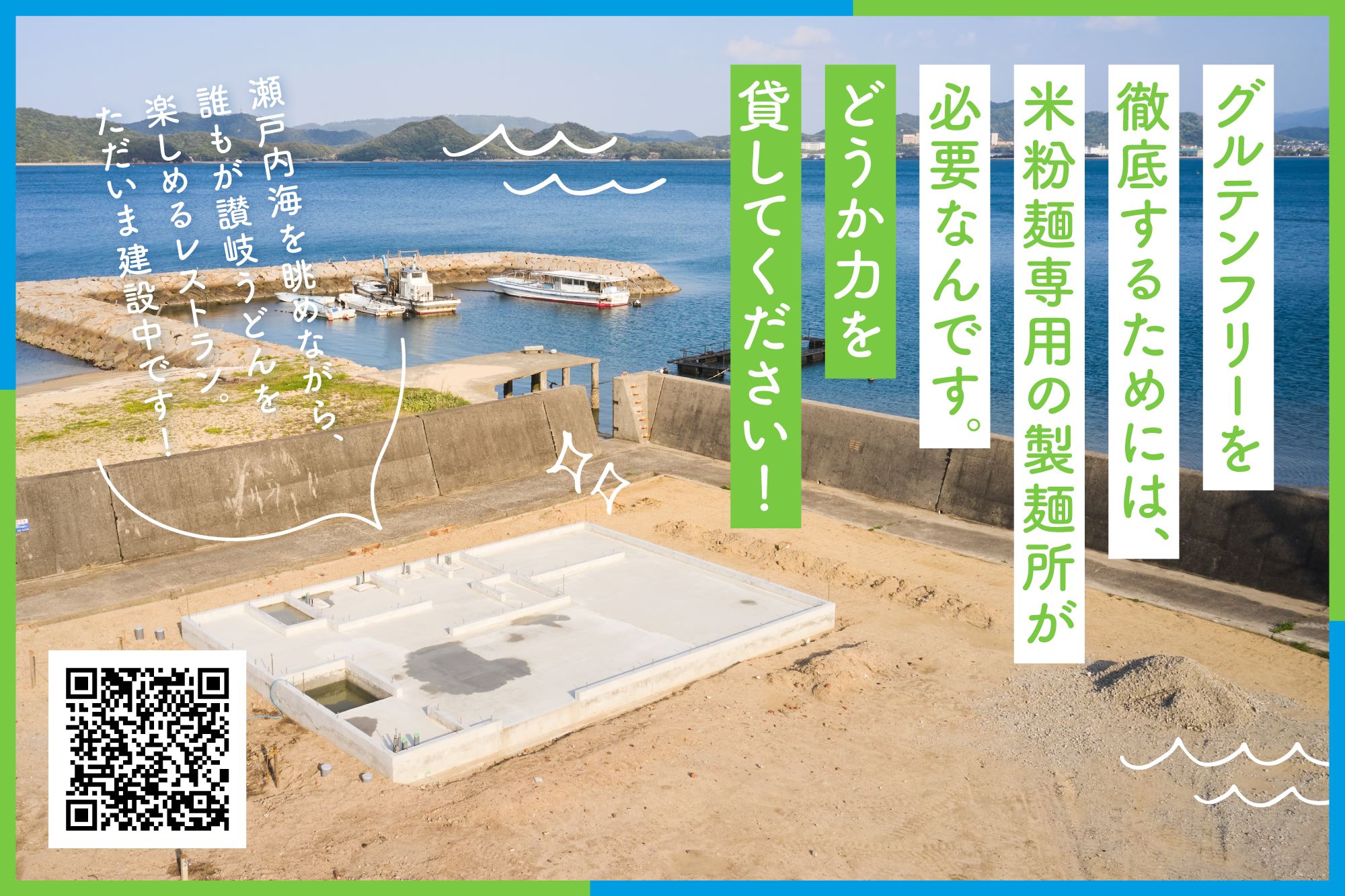 讃岐うどんに欠かせない「小麦粉」や「魚介のいりこだし」。これが理由で食べられない人たちのために、植物由来の原料でグルテンフリーの讃岐うどんを開発し、世界中のあらゆる人がボーダーレスに楽しめるお店を、瀬戸内海が一望できる場所にオープンします。