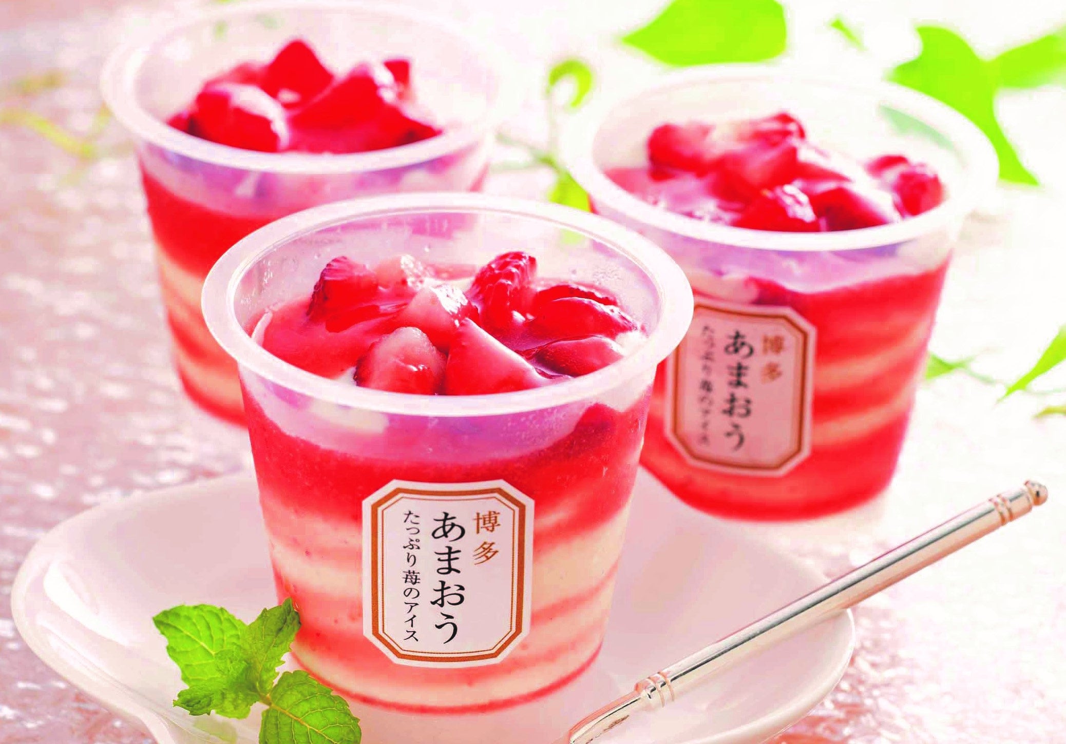 「あかい、まるい、おおきい、うまい」の頭文字を取って名付けられ、その美味しさから“苺の王様”ともいわれる福岡県産の「あまおう」を使用。博多あまおうのソースが入ったアイスの上に果肉を乗せた、苺尽くしのアイスです。