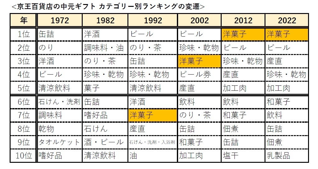 【参考】 お中元のトレンド変遷 ~希少性・日持ち重視から、見栄えの良さもギフト選びのポイントに~ 希少性があり日持ちするといった理由から海苔や洋酒が季節ギフトの定番だった1970~1980年代。その後、「スーパードライ」などのヒット商品が生まれたことによるビールブームの中、1989年にビールが首位となり、以降23年にわたって1位をキープ。2000年代に入ってからは“デパ地下ブーム”“パティシエブーム″により洋菓子の人気が上昇。2003~2011年まで9年連続で2位、2012年から現在まで10年にわたって首位を維持しており、幅広い世代に贈りやすく、見た目にも華やかな洋菓子が現在の季節ギフトの定番となっています。 |