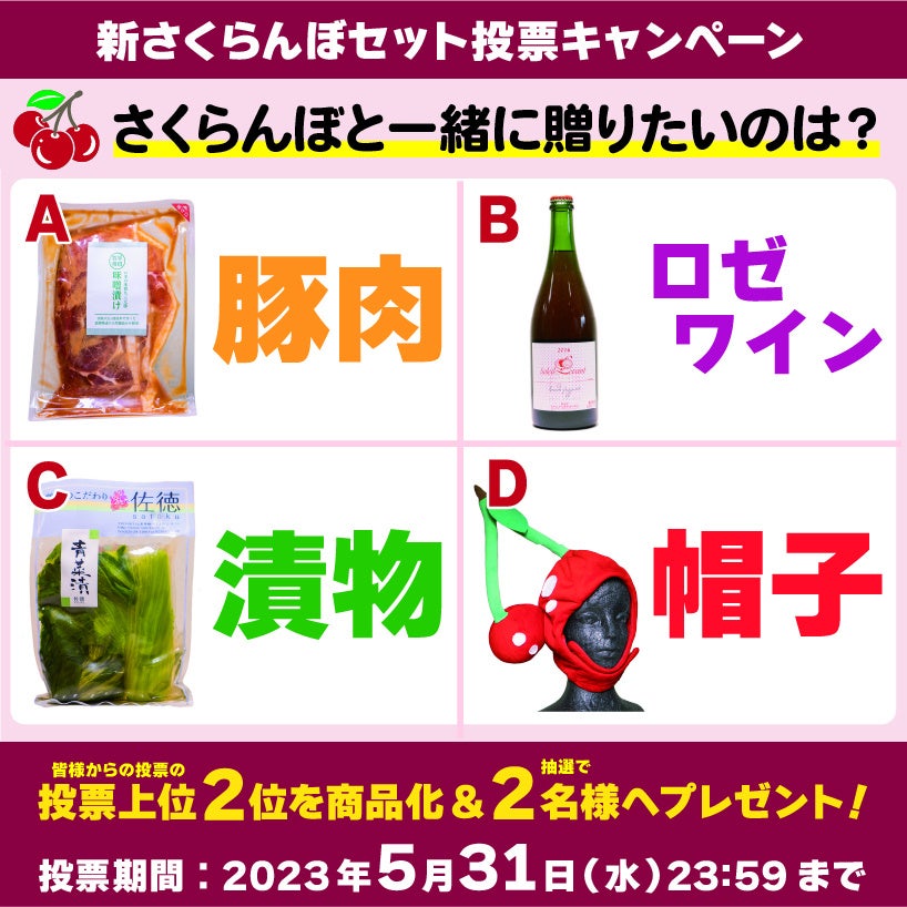 皆様からのアンケート投票で旬のさくらんぼとセットで販売される山形の逸品が決定します。アンケート結果の上位2商品とさくらんぼの新ギフトセットを6月16日(金)から実際に販売いたします。