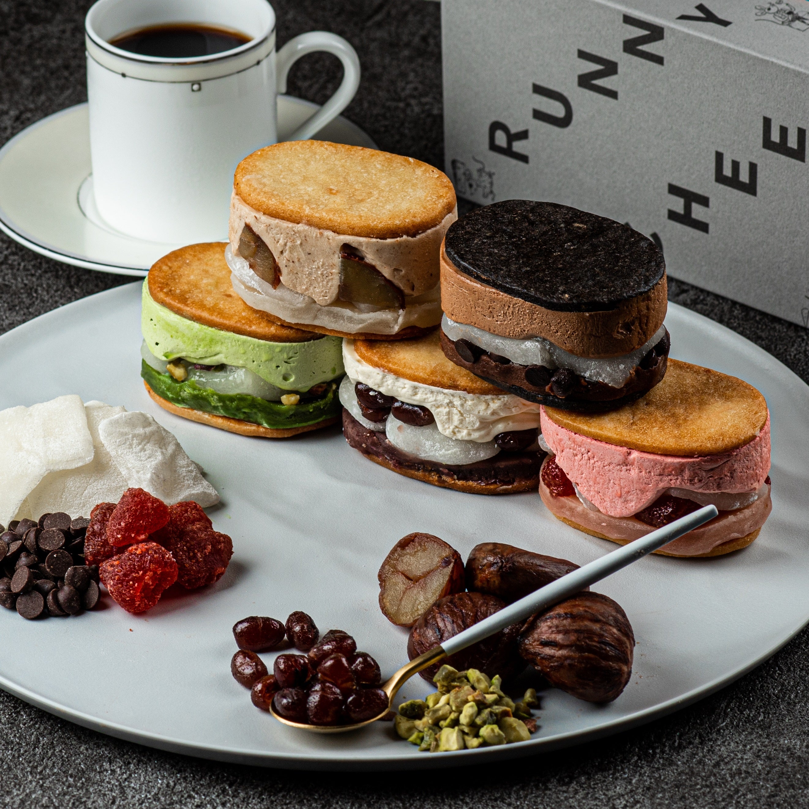 <ラニーチーズ>は、福井県福井市のチーズ料理&スイーツ専門店。創業110年を超える福井県の人気和菓子屋店<村中甘泉堂>のもちもちの羽二重餅に、フレッシュバターをミックスしてチーズクッキーでサンドしています。
