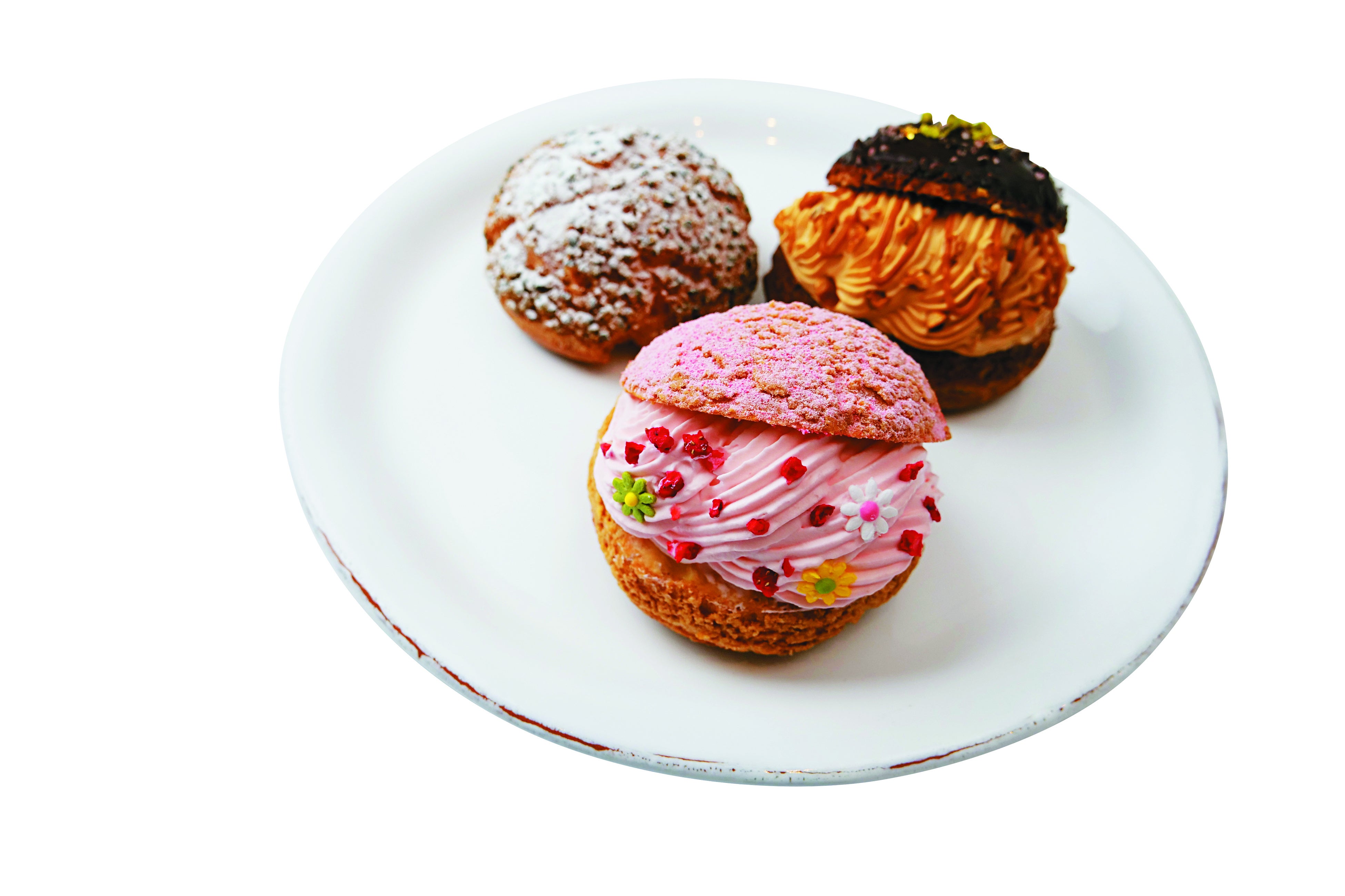 イボンヌのシュー 各種 (ヤギミルクシュークリーム、苺のヤギミルクシュークリーム、キャラメルナッツのヤギミルクシュークリーム/各1個) 350円〜