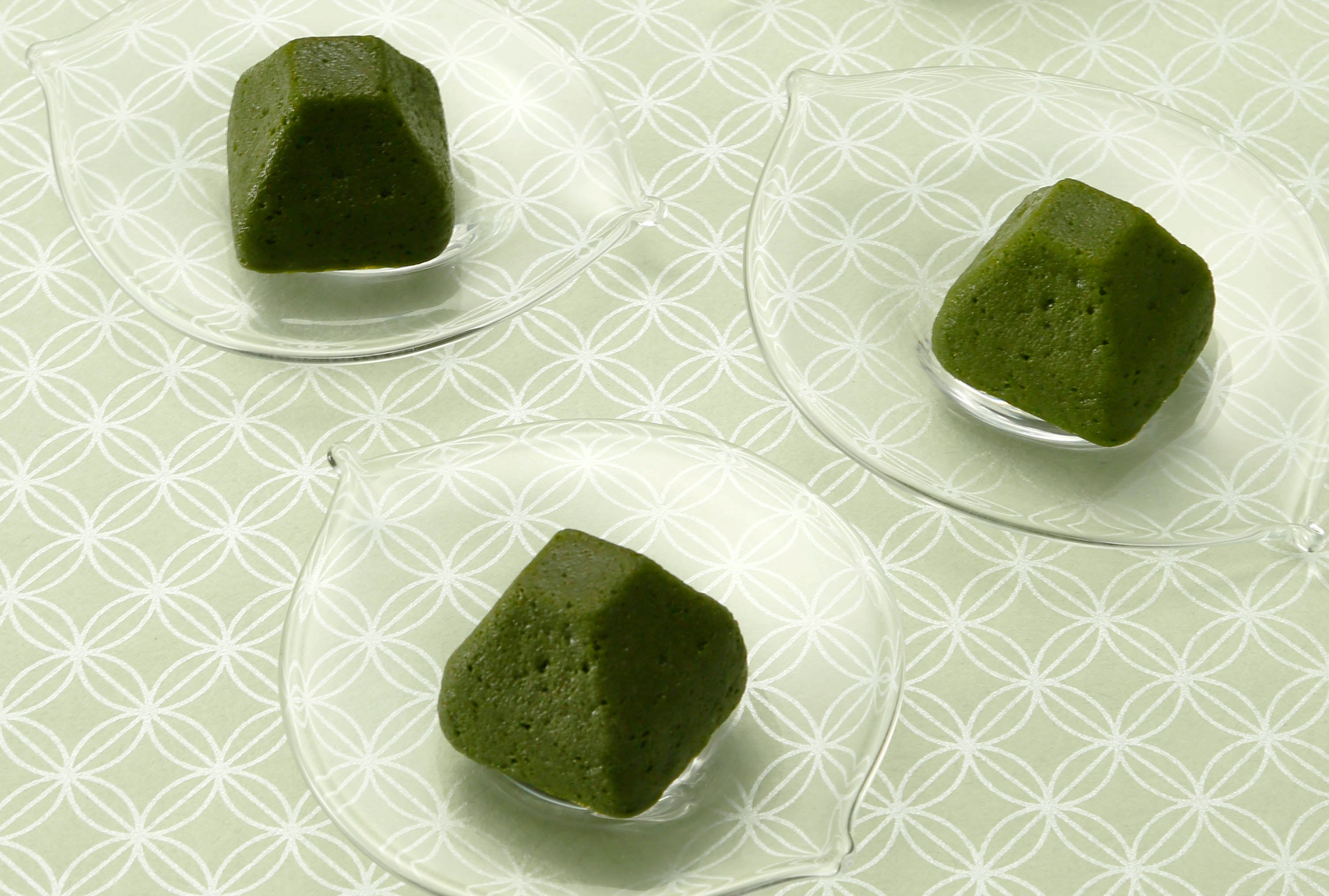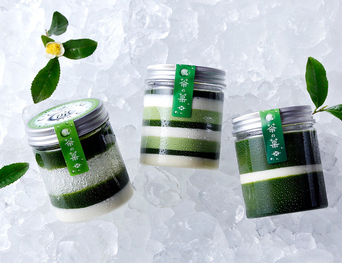 お濃茶ラングドシャ「茶の菓」の味わいを夏でも涼やかにお楽しみいただけるように、お濃茶やホワイトチョコレートの層を重ねてジュレ仕立てにしました。ゼリーやパンナコッタなど異なる口どけでお濃茶ラングドシャをイメージした、つるんと暑い日に嬉しい”夏の「茶の菓」”です。