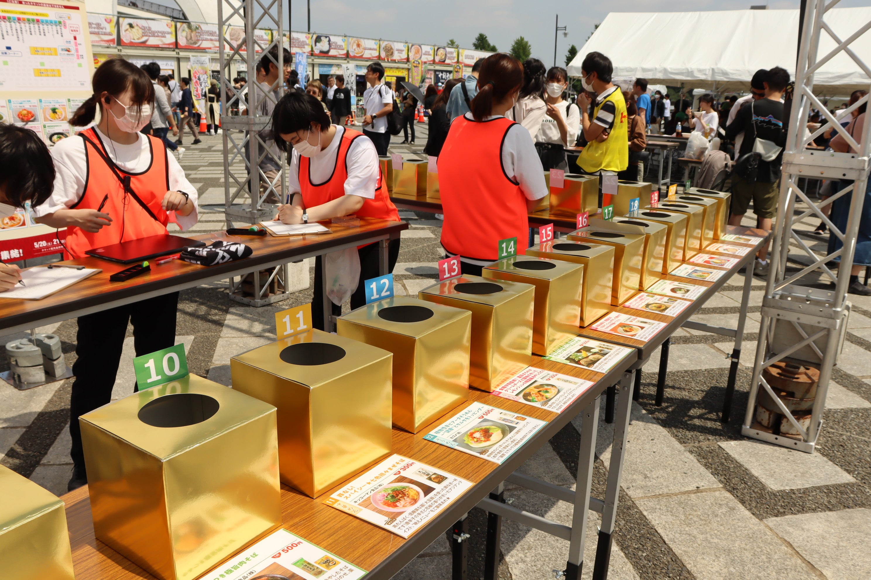 (1)各ブースで商品を購入時、投票用のコインを受け取り、(2)試食後、美味しいかったメニューを選び、(3)会場内中央に設置の投票コーナーにて該当のメニュー箱にコインを投入し投票。