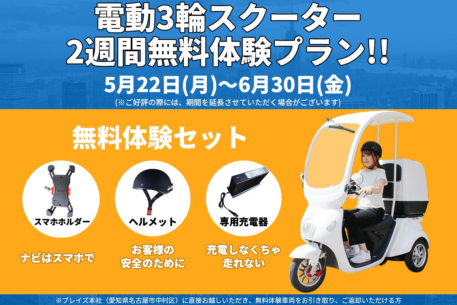 この度、ブレイズの提唱する新ブランドコンセプト「LIFE EV」(*下記参照)の下に展開する、電動3輪スクーター「EVデリバリー(ミニカー登録モデル)」を個人ユーザーのお客様にも気軽にご体感いただけるように、『2週間の無料体験プラン』をご用意いたしました。