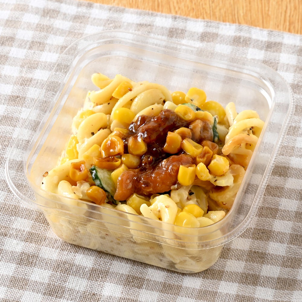【内容】ホテイフーズの「やきとり(たれ味)」、はごろもフーズの「シャキッと!コーン」を使用し、粒マスタード、ブラックペッパー等で味にアクセントをだしたマカロニサラダです。やきとりの甘辛さとコーンの食感が特長です。