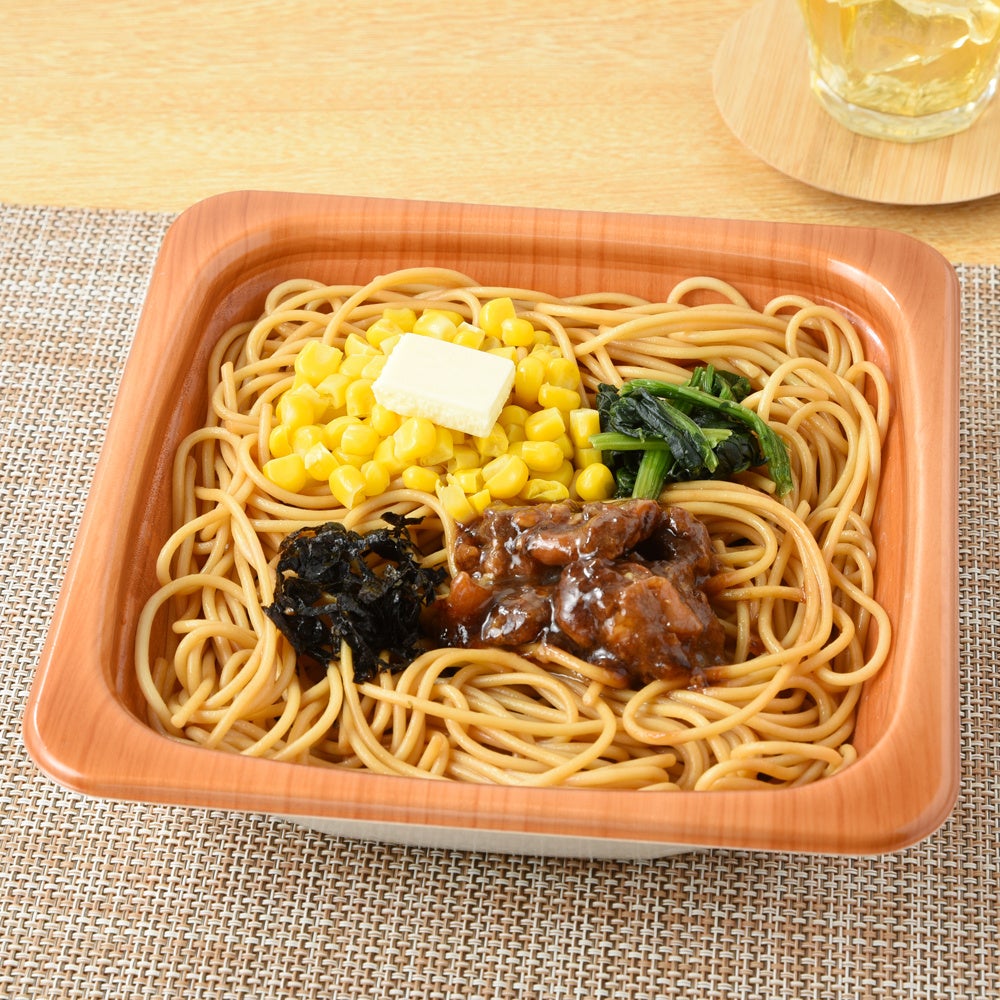 【内容】醤油やだしつゆで味付けしたパスタに、ホテイフーズの「やきとり(たれ味)」、ほうれん草、バター、はごろもフーズの「シャキッと!コーン」、刻みのりなどをトッピングしました。コーンの甘みとバターの香り、甘辛いやきとりでクセになるおいしさです。