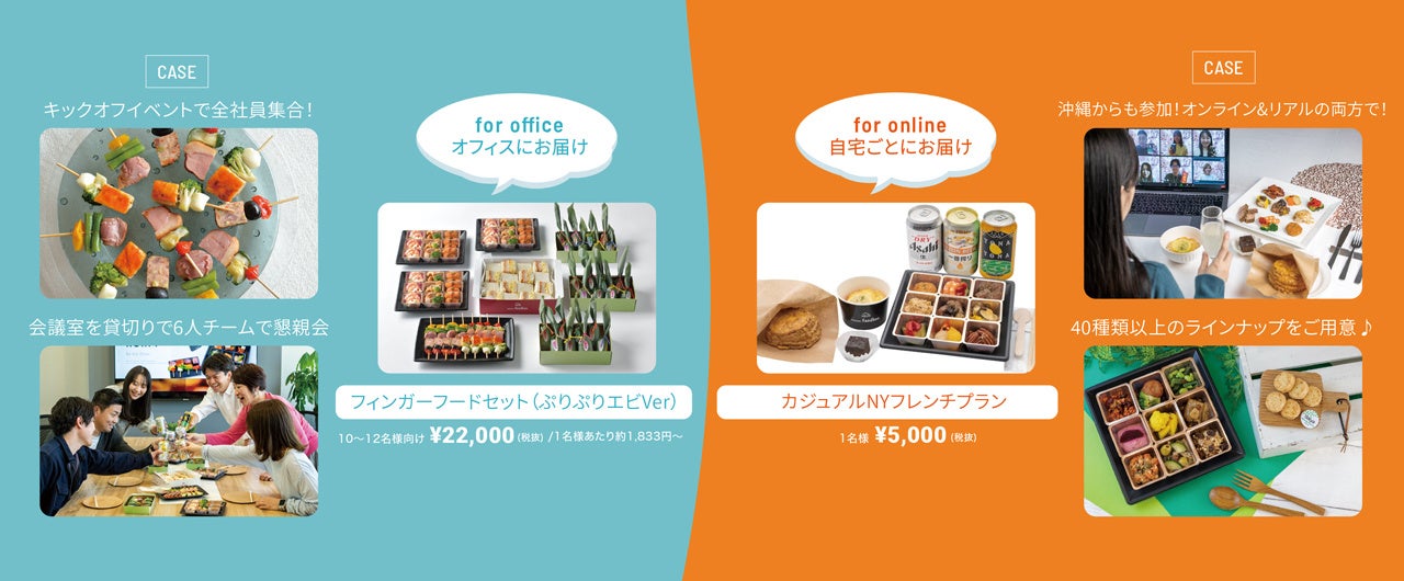 そこで「nonpi foodbox®」は、リアルな懇親会向けプランを追加し、コロナ禍以前にケータリングサービス業界で10年以上培ったノウハウも活かしながら、「nonpi foodbox® for office(オフィス)」と「nonpi foodbox® for online(オンライン)」の選択を可能にし、新しい時代のハイブリットケータリングサービスとしてリニューアルすることにしました。