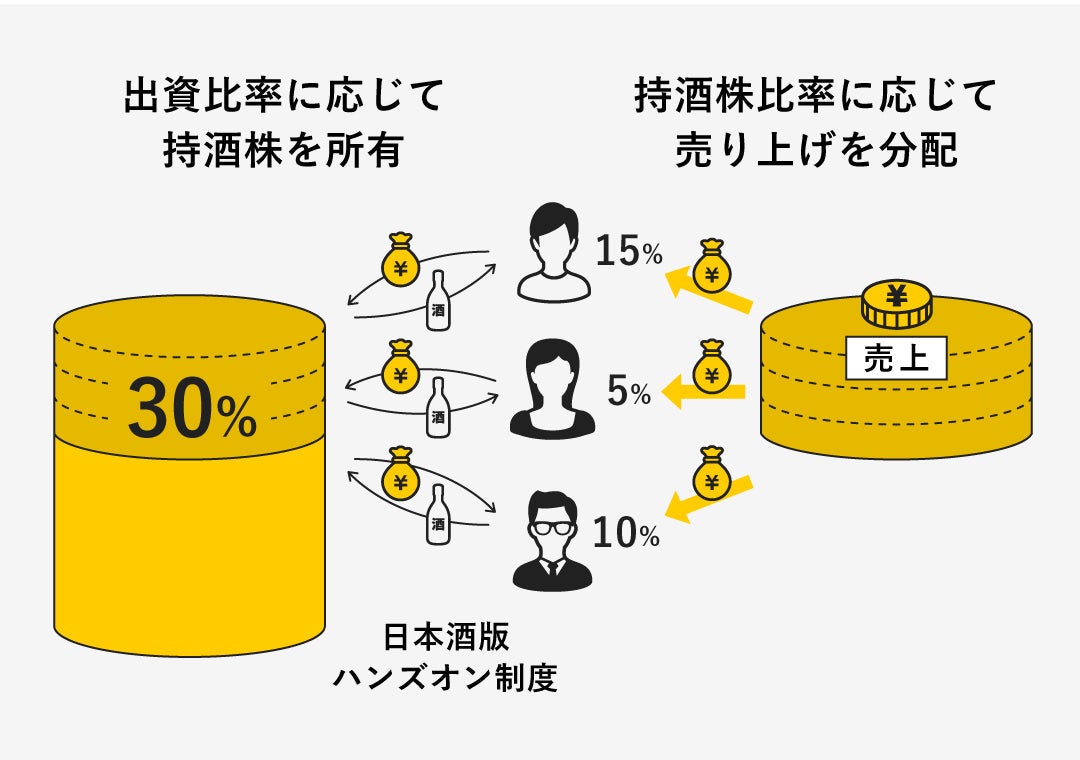 最終的に①各オーナーの販売数量 ②持酒株比率に応じて売上が分配されるミニ株式会社のような仕組みです。