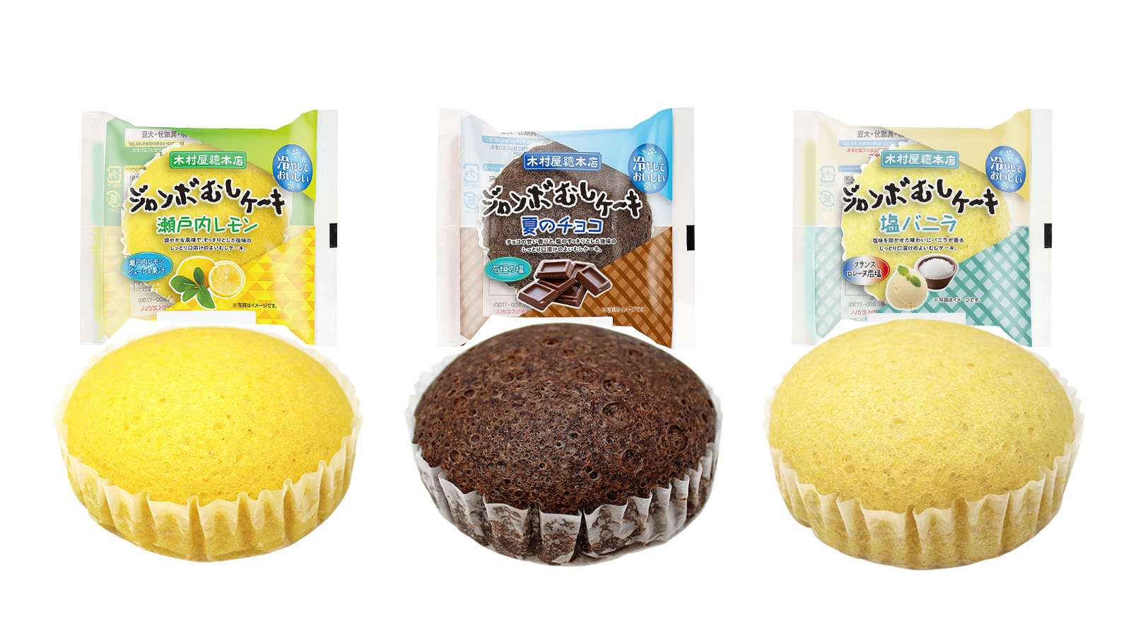 「瀬戸内レモン」は瀬戸内レモン果汁などを使用した、爽やかで冷やしてもおいしいむしケーキです。「夏のチョコ」にはまろやかな塩味が特徴の石垣の塩を、「塩バニラ」はスイーツなどでよく使われるフランス・ロレーヌ岩塩を使用するなどフレーバーに合わせた塩を使っており、素材にもこだわり仕立てました。