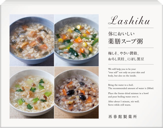株式会社再春館製薬所(本社:熊本県上益城郡益城町、代表取締役CEO:西川正明、以下再春館製薬所)が昨年立ち上げた、現代人のライフスタイルに即した漢方発想インナーケアなどの商材を提案するブランド「Lashiku(ラシク)」。このたび、同ブランド商品「体においしい 薬膳スープ粥 4種アソート」(以下 「体においしい 薬膳スープ粥」)が、株式会社Sky Recruiting Solutions(東京本社:東京都渋谷区、京都本社:京都府京都市下京区、共同代表:大西洋平・村木慎吾)の運営する「産前産後ケアホテル ぶどうの木 京都院」内での夜食メニューとして採用され、提供を開始しました。