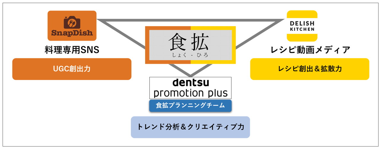 そこで、電通プロモーションプラスの「食」の専門プランニングチームと、料理リテラシーの高いユーザー が質の高いUGCを生み出している料理専門SNS「SnapDish」を運営するスナップディッシュ、専門家による高品質なレシピを創出しユーザー から高い人気を得ているレシピ動画メディアの「DELISH KITCHEN」を運営するエブリーが協業し、「食」の新体験を創出するソリューション「食拡(しょくひろ)」を開発いたしました。