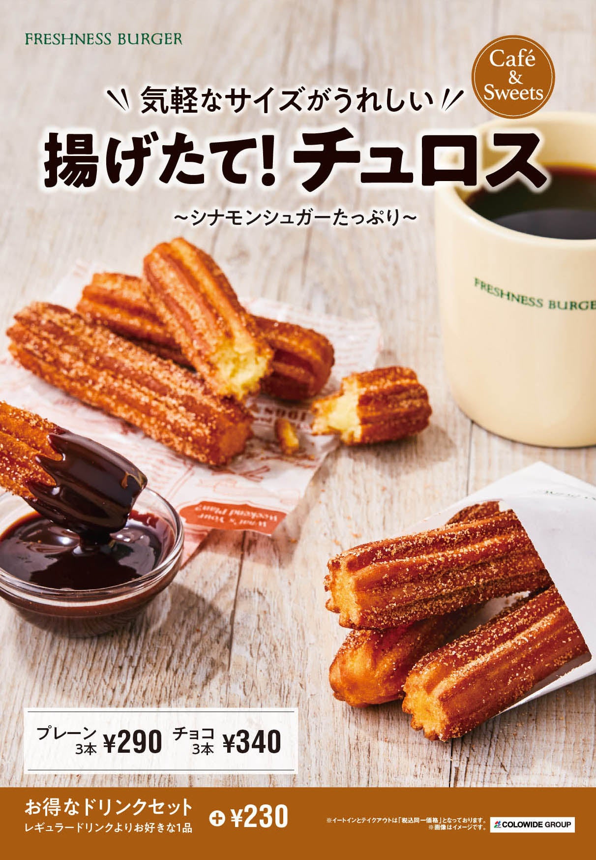 お好きなチュロスに+230円で、こだわりのコーヒーやオーガニックティー・ノンカフェインのハーブティーなどレギュラードリンクよりお好きな一品をお選びいただけます。