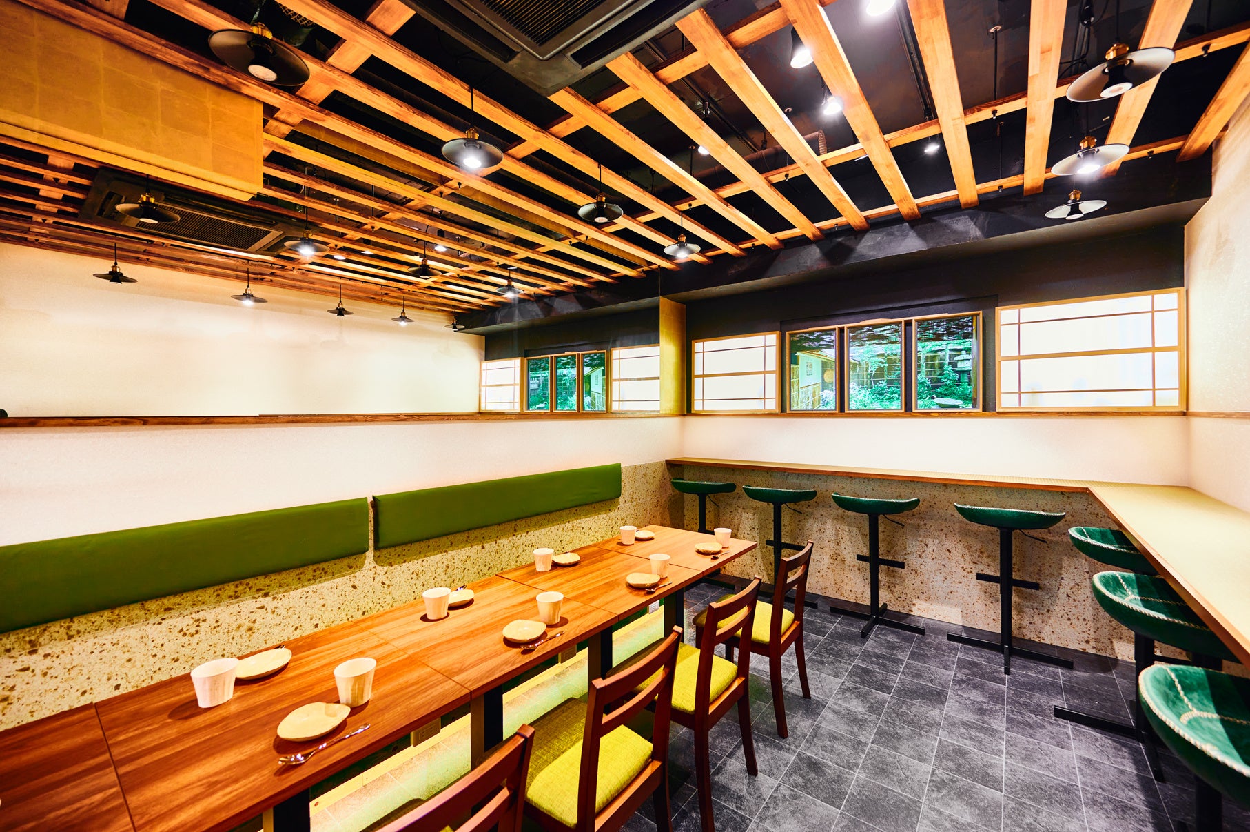 店を構えるのは、新宿駅徒歩1分の地下2階。店内に入ると、余計な虚飾が排され、忙しない大都会の華やかさを感じさせない、凛として質素な佇まいが広がる。真新しい空間にはゆったりとした距離感が心地よい席が設けられ、目の前の板場では江良氏が流麗な所作を魅せながら、かき氷と寄り添い合う一杯を提供してくれる。物腰柔らかな亭主との会話も楽しみながら、この店ならではの空間を味わえます。