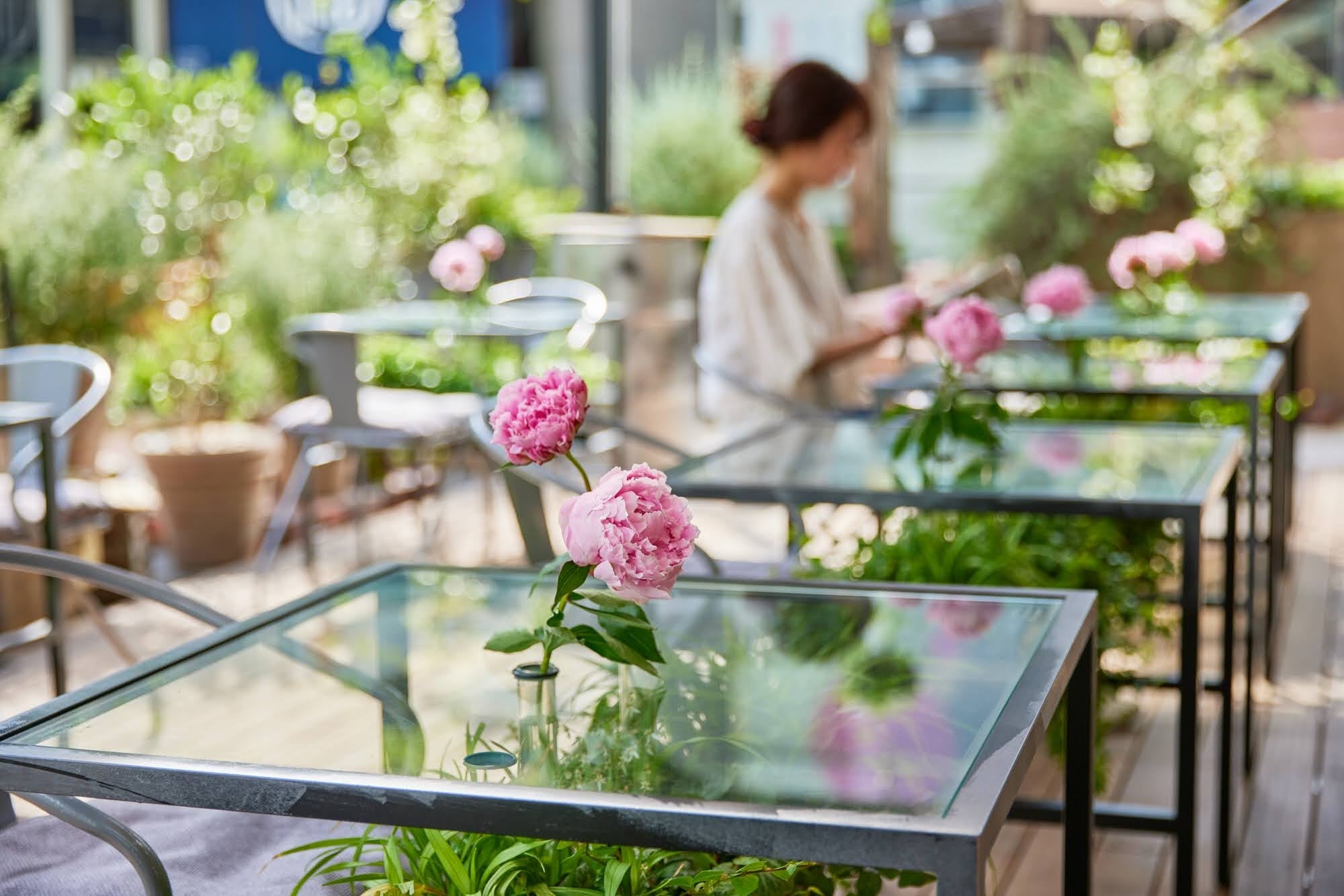 テラス席で心地よく過ごすのがおすすめ!ティーハウスではピオニーをイメージした限定スイーツが登場