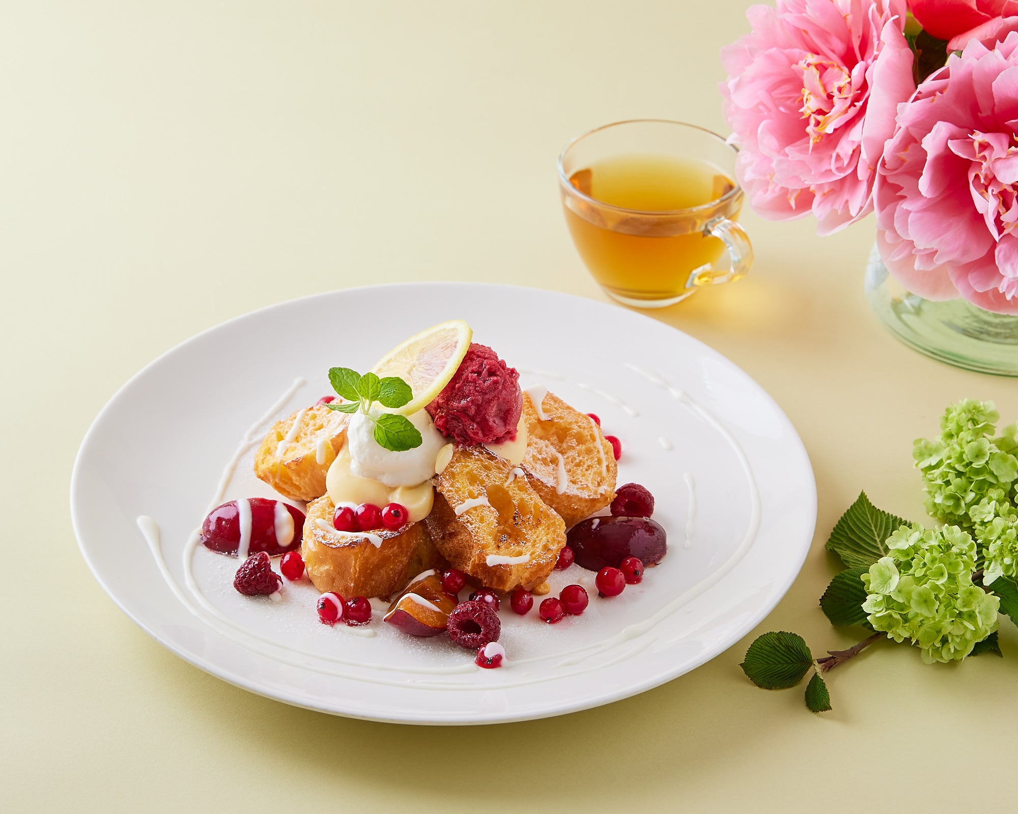 ティーハウスで一番人気メニューのフレンチトースト。旬のみずみずしいプラムと甘酸っぱいベリー、カシスシャーベットも添えて、さっぱりと仕上げました。