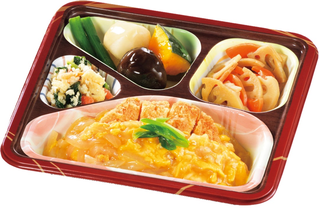 とんかつ卵とじ風、里芋の煮物、れんこんの柚子胡椒炒め、小松菜と人参の白和え