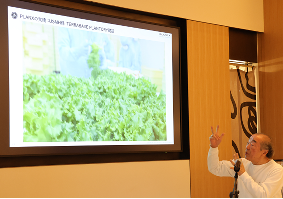 人口爆発による、きたる食料不足を見据え、創業者の山田氏は2013年に千葉大学で植物工場と出会い、2014年6月に光と空気と水で植物を生産する装置を作るプランテックスを創業しました。20種のパラメータを個別に制御する、密封型の植物工場を、組み立てから設計まで独自に設計・開発し、新商品「京橋レタス」 として販売を開始しています。20種の環境パラメータをAIで解析し、βカロチン30倍、ビタミンC50倍などを再生産できるレシピ化することで、高品質のレタスの生産を可能にしています。