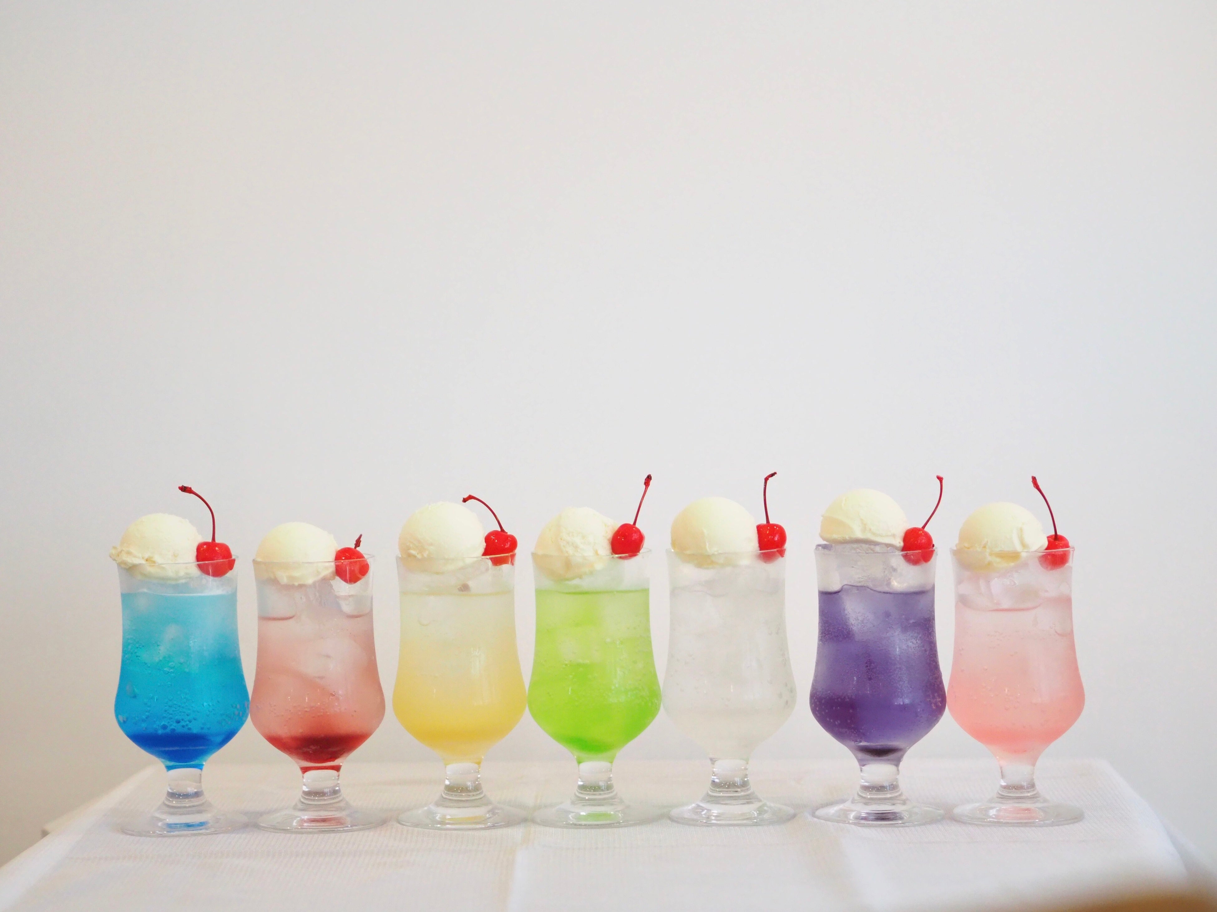 自家製プリンと7色(青、赤、黄、緑、白、紫、ピンク)のクリームソーダを注文し、SNSにアップ‼︎