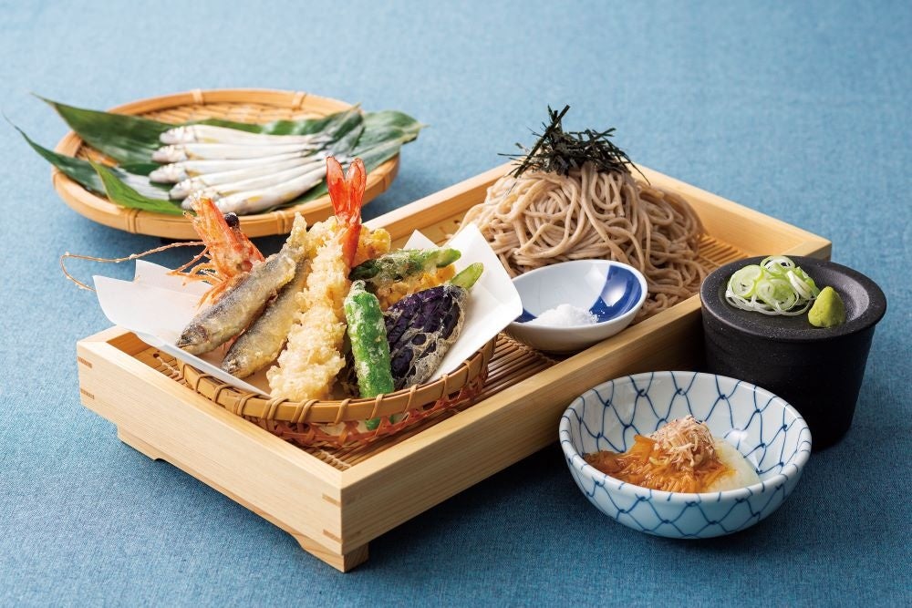 稚鮎は5月〜6月に旬を迎える川魚です。身と骨が柔らかく香りとほろ苦さを感じ、天ぷらにすると旨みが引き立ちます。茄子、コーン、アスパラ、獅子唐の夏野菜も天ぷらにし、この時期が一番おいしい旬の食材と、プリっとした海老をそばと一緒にお召し上がりいただけるメニューに仕上げました。なめ茸おろしをそばつゆに入れると、初夏の暑さを感じる日差しの強い日でもさっぱりとお召し上がりいただけます。