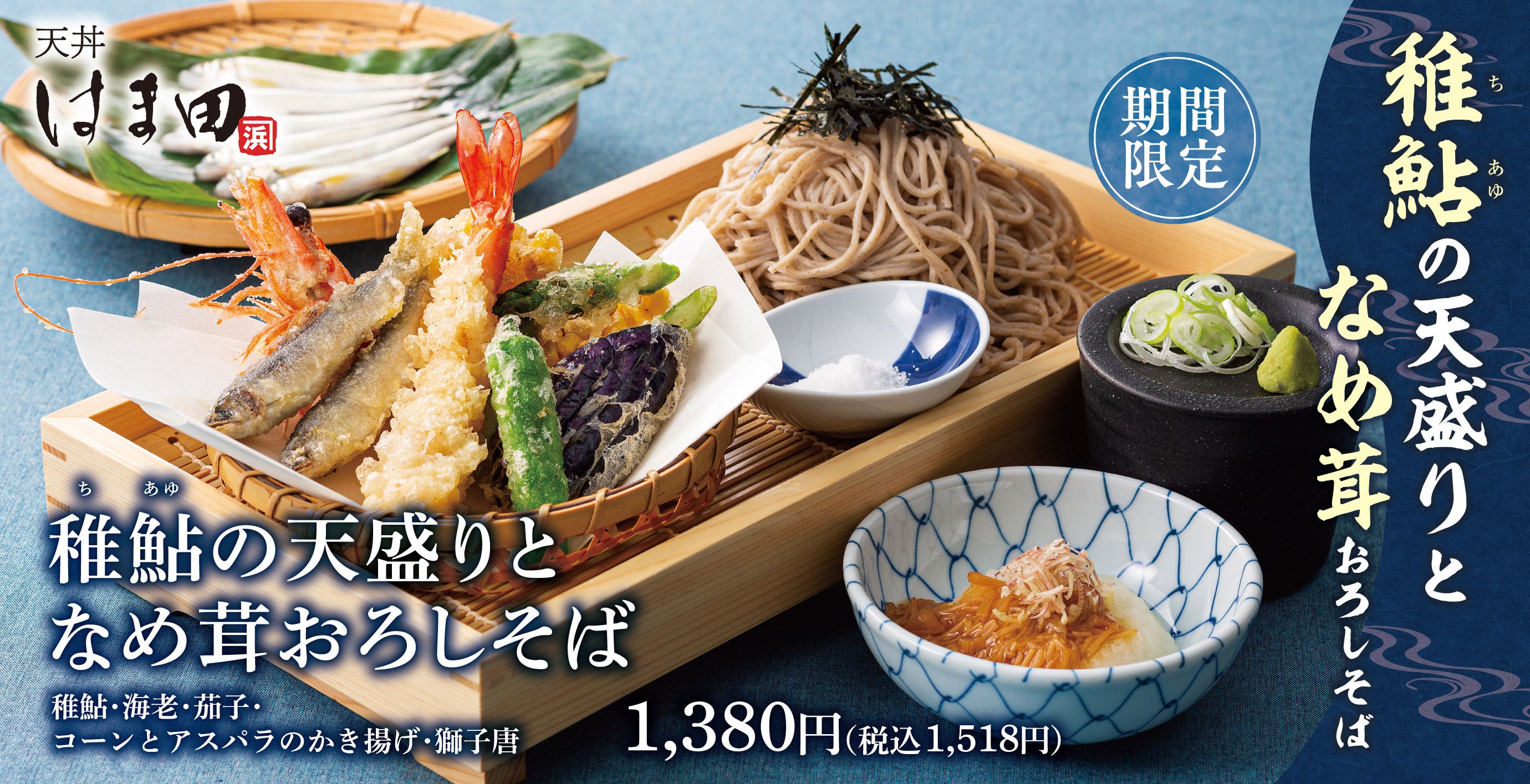 「こんなお店があったらいいな」を身近に。がコンセプトの天丼はま田は、旬の食材を使用した新メニュー「稚鮎の天盛りとなめ茸おろしそば」を販売開始いたします。