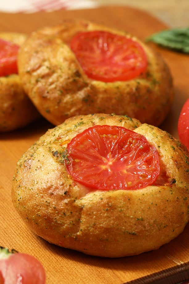 ・セミドライトマトを練り込んだフランス生地に、5種類のチーズ(ゴーダ、モッツァレラ、エメンタール、カマンベール、クリームチーズ)を使用したチーズソース、ダイスチーズを包み、フレッシュトマトを乗せて焼き上げ、仕上げにバジルペーストを塗ったイタリアンなチーズフランスです。