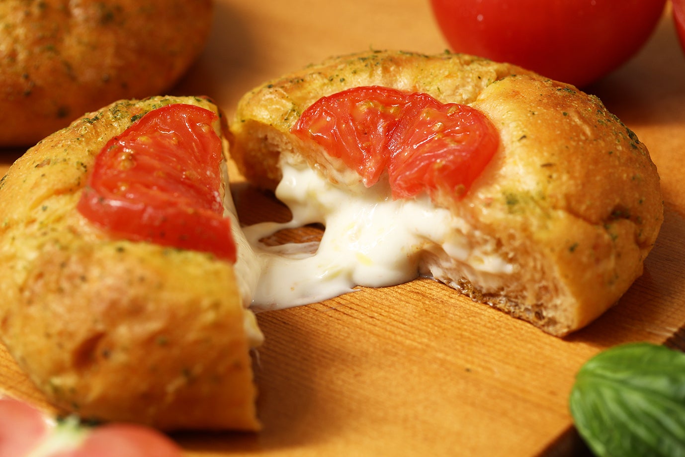 ・セミドライトマトを練り込んだフランス生地に、5種類のチーズ(ゴーダ、モッツァレラ、エメンタール、カマンベール、クリームチーズ)を使用したチーズソース、ダイスチーズを包み、フレッシュトマトを乗せて焼き上げ、仕上げにバジルペーストを塗ったイタリアンなチーズフランスです。