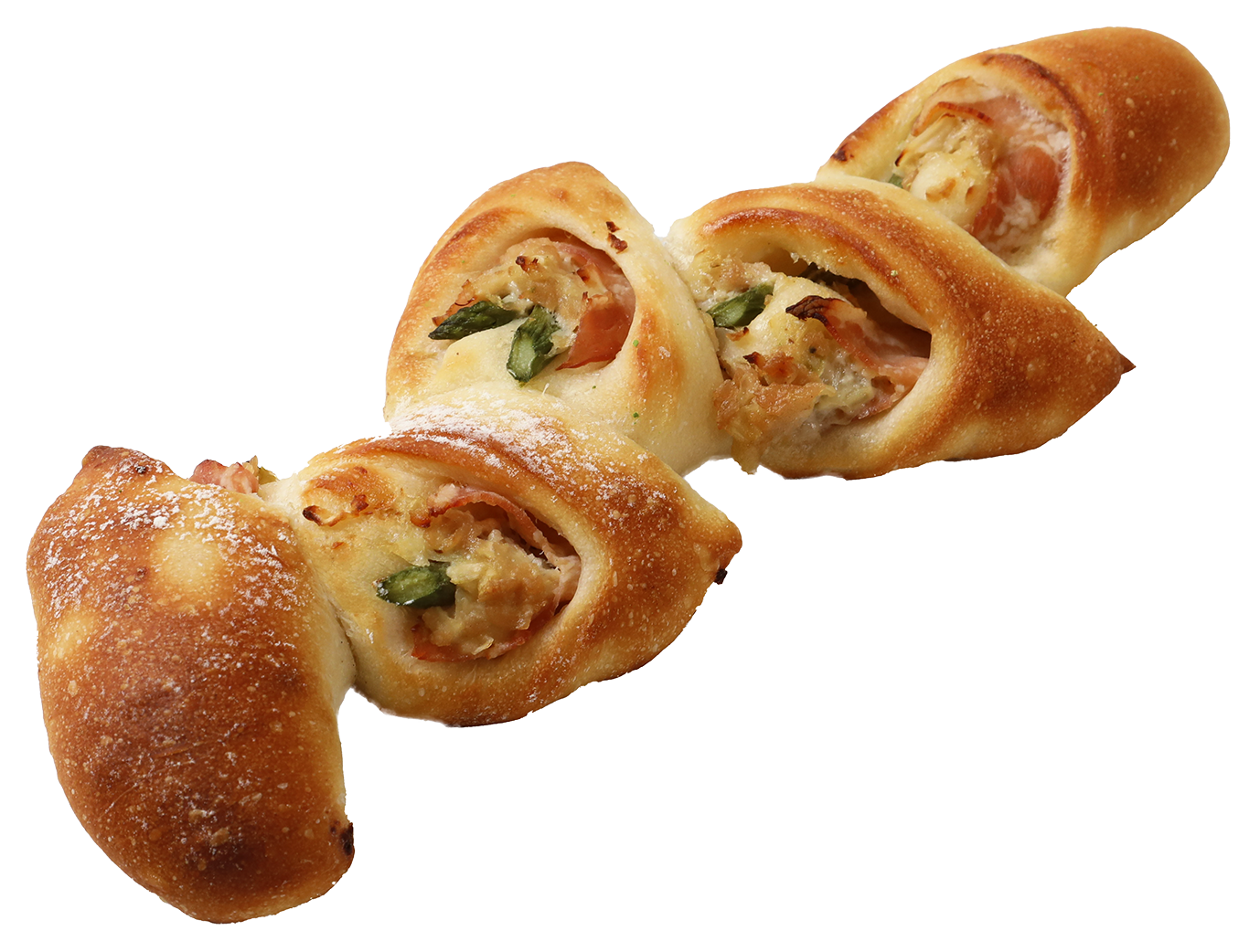 柚子胡椒香るフィリングに、アスパラとベーコンを合わせました。噛み応えのあるハード系の生地に、ベーコンのジューシーな旨味。そこにアスパラのシャキッとした食感が加わり、まるでアスパラベーコンを連想させる味わいに仕上げました。