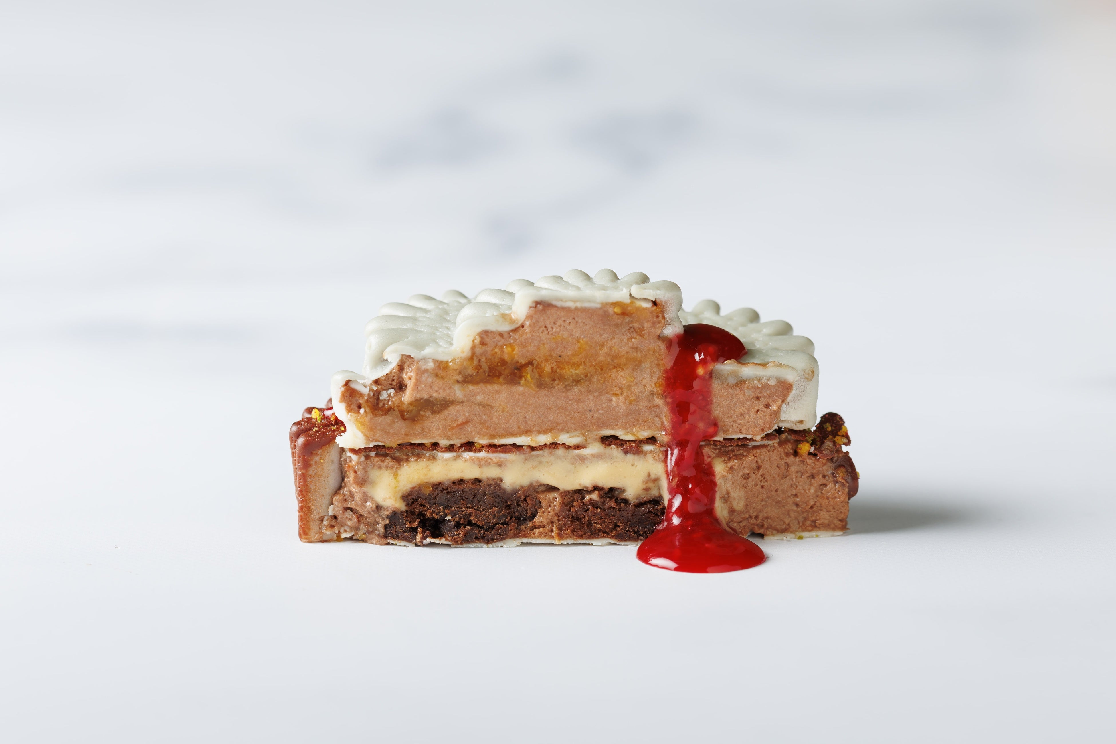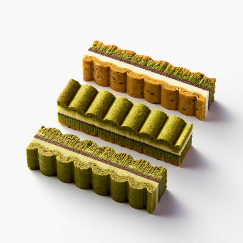 ゴマ・抹茶の波型サブレに、宇治抹茶を贅沢に使用。軽やかなクリームと濃厚なビーントゥバーチョコレートを挟んだ、サクサク食感の楽しいクリームサンドチュイール。