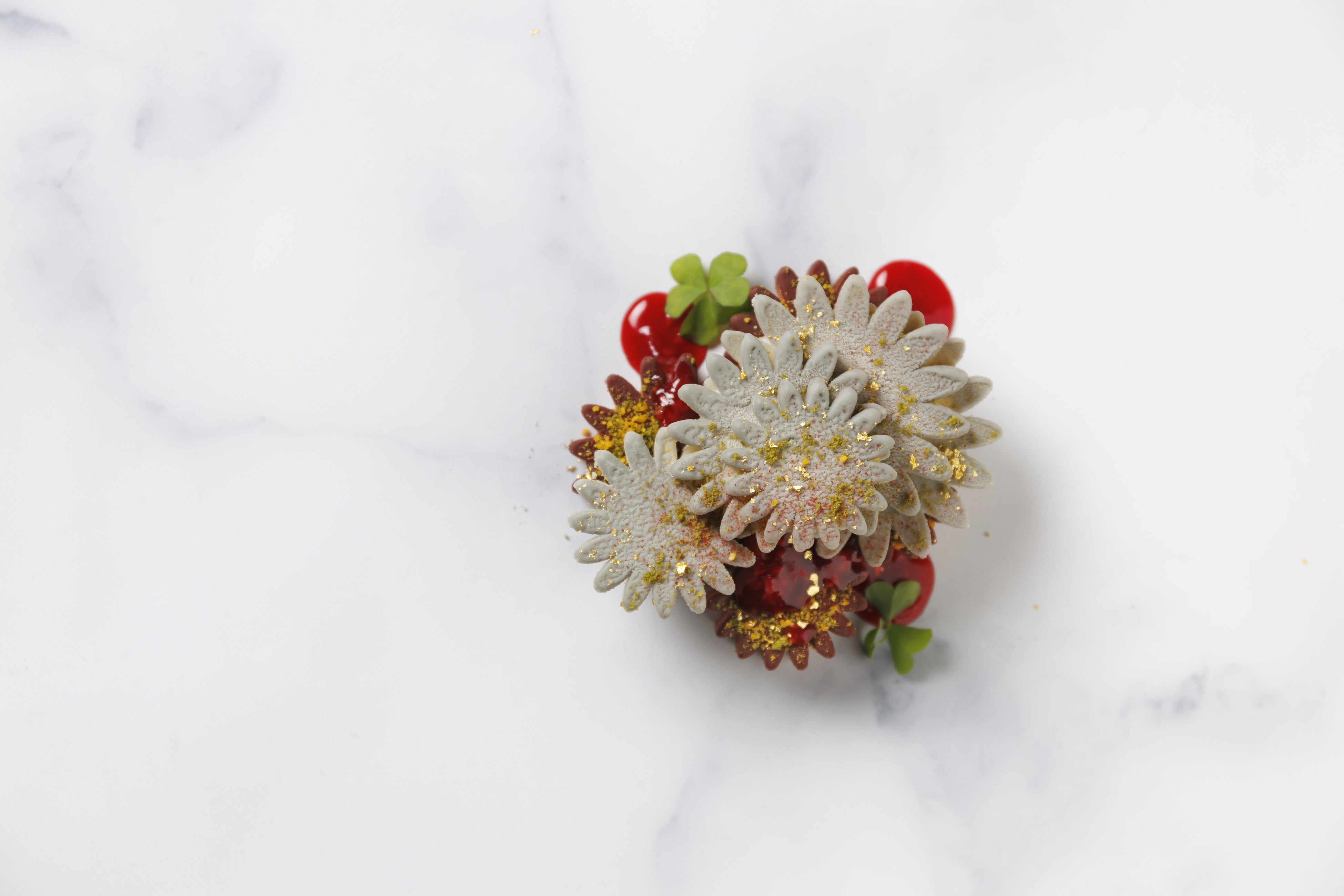 “歯車”は、チョコレート業界をはじめとした世界の産業を表現しており、一つだと回らない歯車が、その他の歯車と噛み合う事によって動き出す様子を表現。下は、パンデミックの影響で止まってしまった錆びた歯車、上は錆が取れた新しい歯車を表しています。今後のチョコレート業界をイメージしたカカオバター入りのフランボワーズのソースが、様々な産業に影響を与える潤滑油のような存在であることを意味しています。
