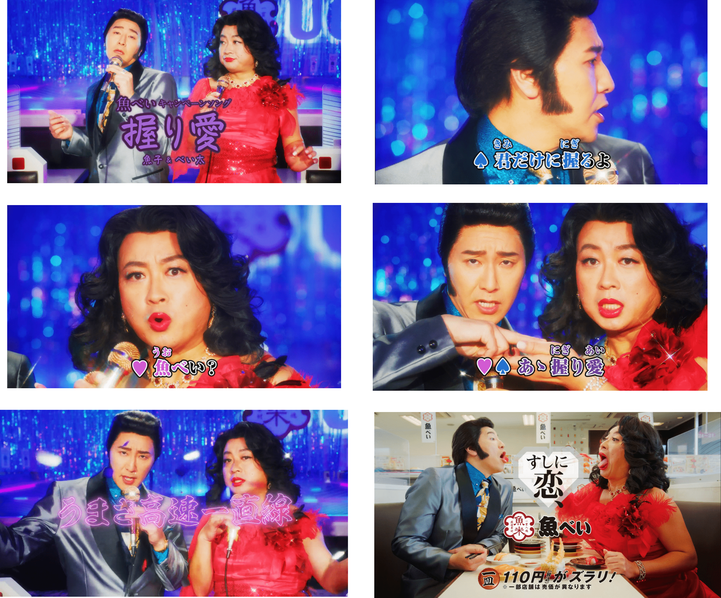 歌謡曲デュオ「魚子&べい太」に扮したチョコレートプラネットのお二人が、魚べいの店内でCMソング「握り愛」を熱唱。曲の最後を締めくくる「うまさ高速一直線」というフレーズに、魚べいの「こだわりの寿司をまっすぐあなたに届けたい」という想いを込めて歌い上げます。
