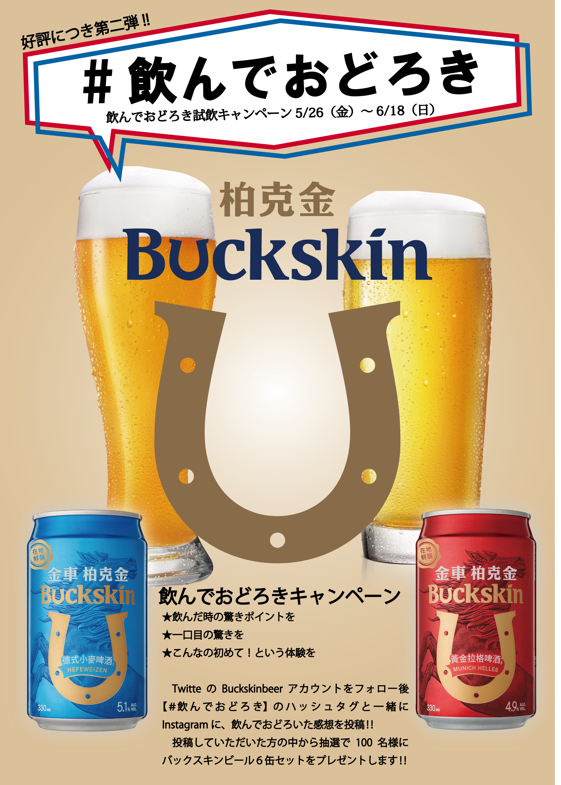 今回開催する飲んでおどろきキャンペーンに参加し【#飲んでおどろき】のタグを付けてTwitterに投稿していただいた方の中から抽選で100名様にバックスキンビール6缶セットをプレゼントいたします。