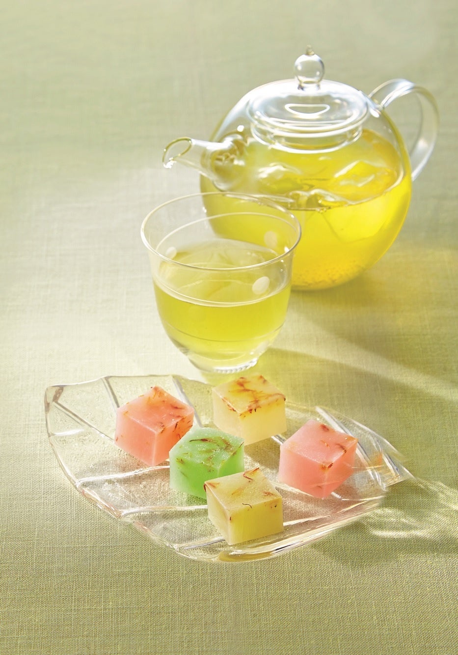 外はシャリ、中はぷるん。地元の高校生と共同開発した、紅花の花弁入りの姿も美しいお菓子です。