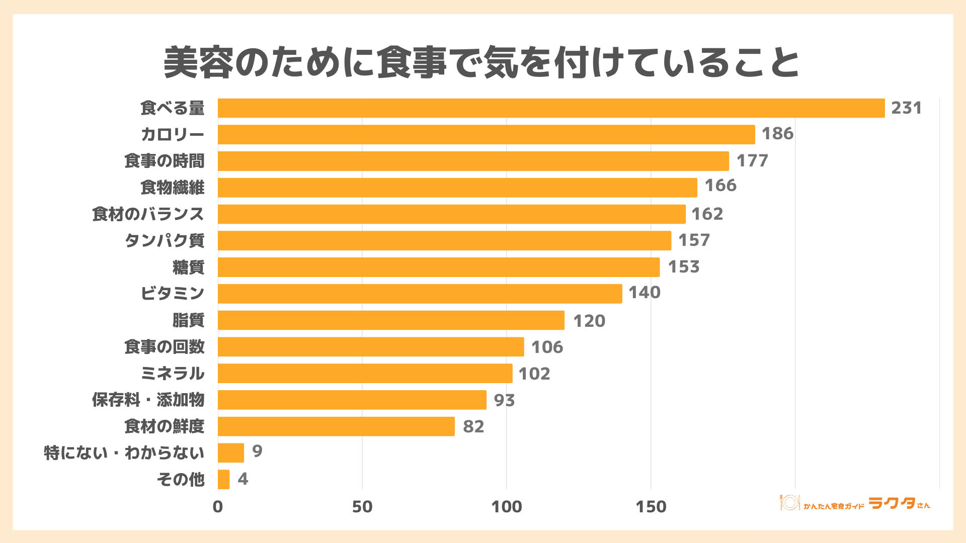 「保存料・添加物」「食材の鮮度」については比較的少ない結果となりました。美容への影響を考える際に、まず意識するのが量や栄養であり、食材の鮮度や保存料については意識されにくいのかもしれません。