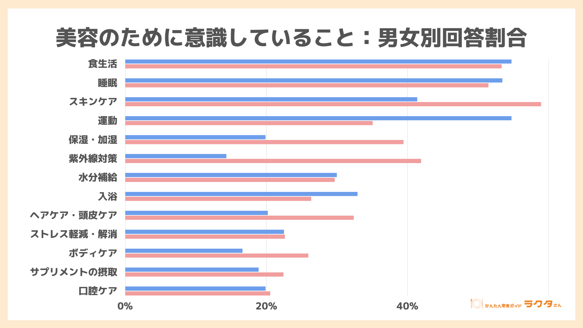 一方で「運動」は男性の回答割合が大きくなっています。男性は健康と美容のために運動を重視する傾向があるようです。また「入浴」も比較的男性の回答割合が大きく、肌の清潔さや体臭対策のために気を付けている人が多いのかもしれません。