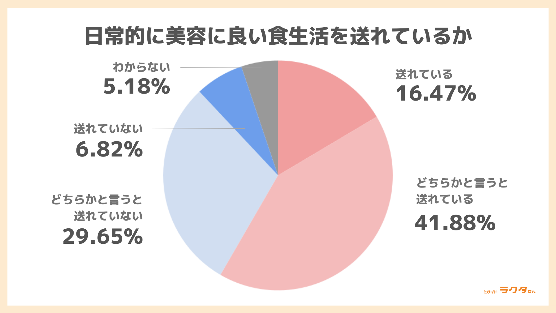 「送れている」が16.47%、「どちらかと言うと送れている」が41.88%で、約60%が美容に良い食生活を送れていると自己評価しています。